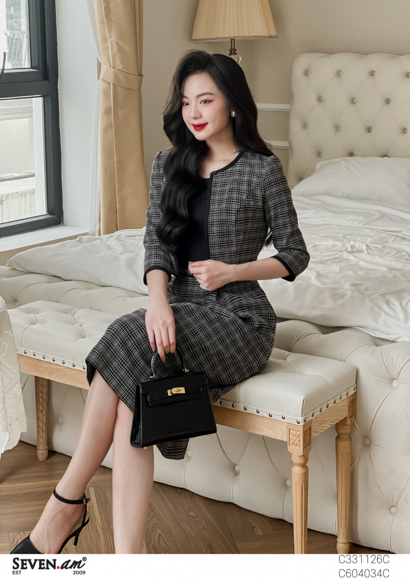Áo khoác lửng tay lỡ Dạ kẻ caro trắng viền đen móc cài cổ tròn
