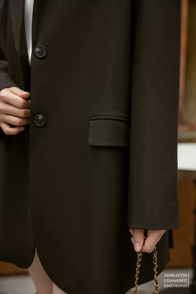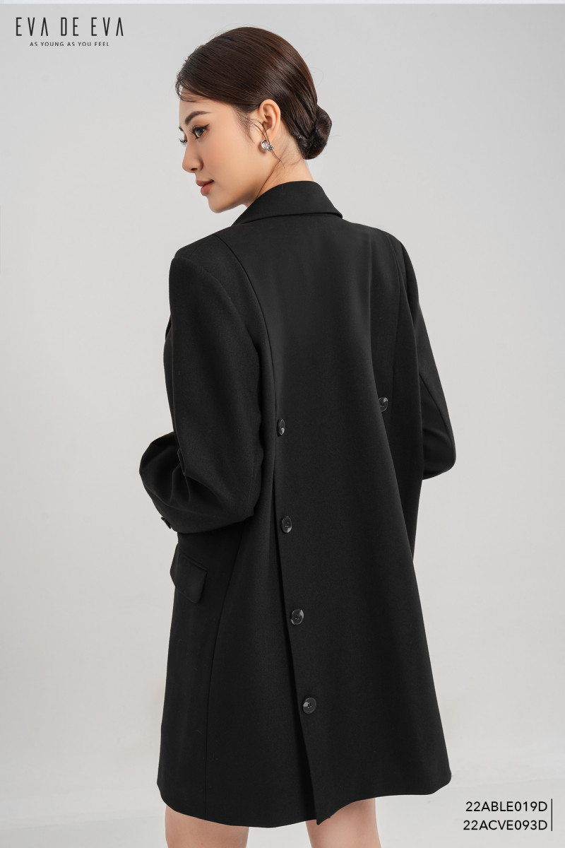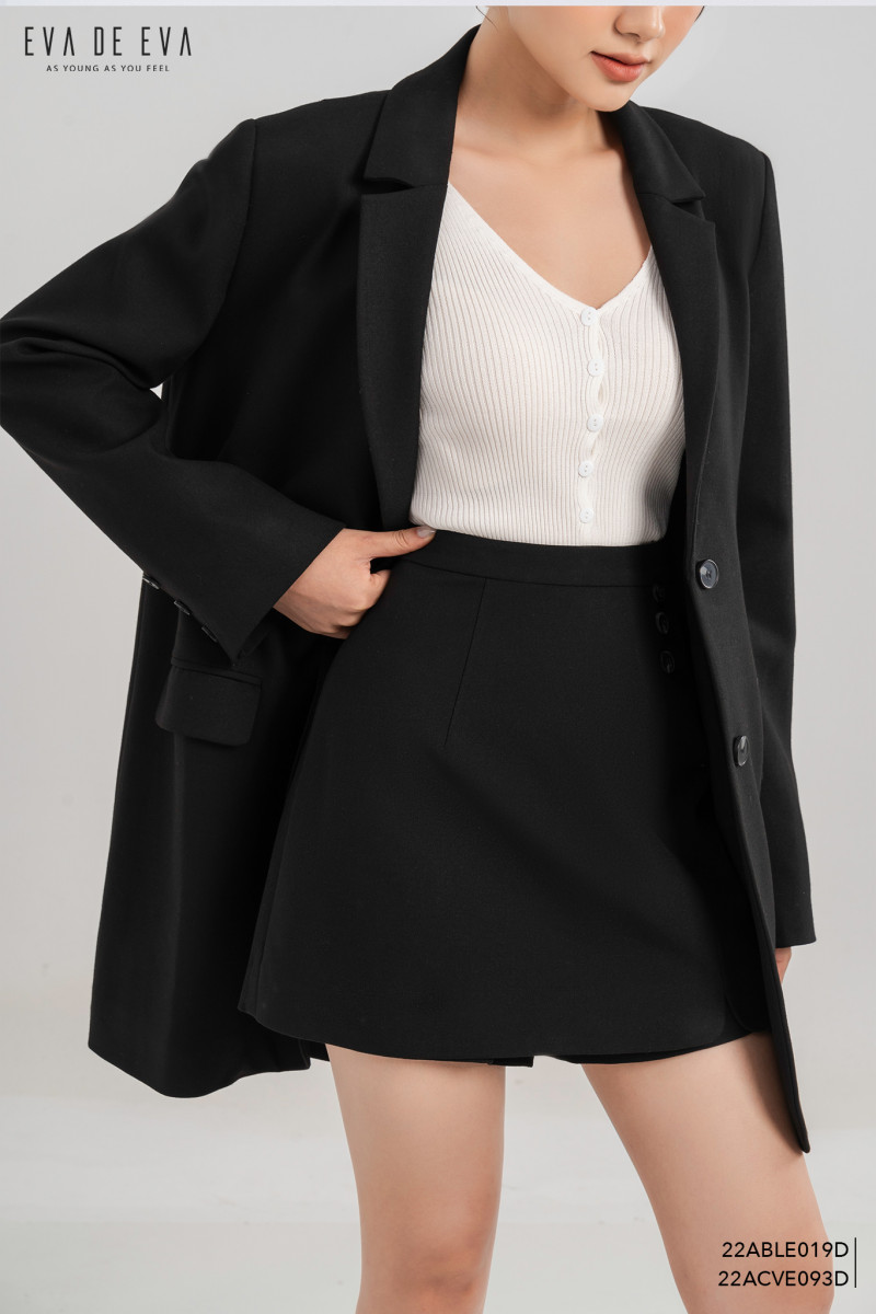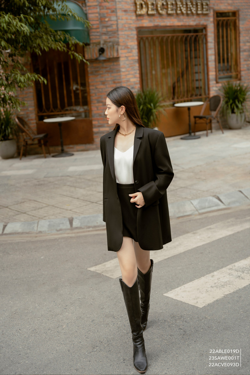 Áo blazer đen dáng suông, cổ bẻ 2 ve, có túi nắp 2 bên hông tiện dụng