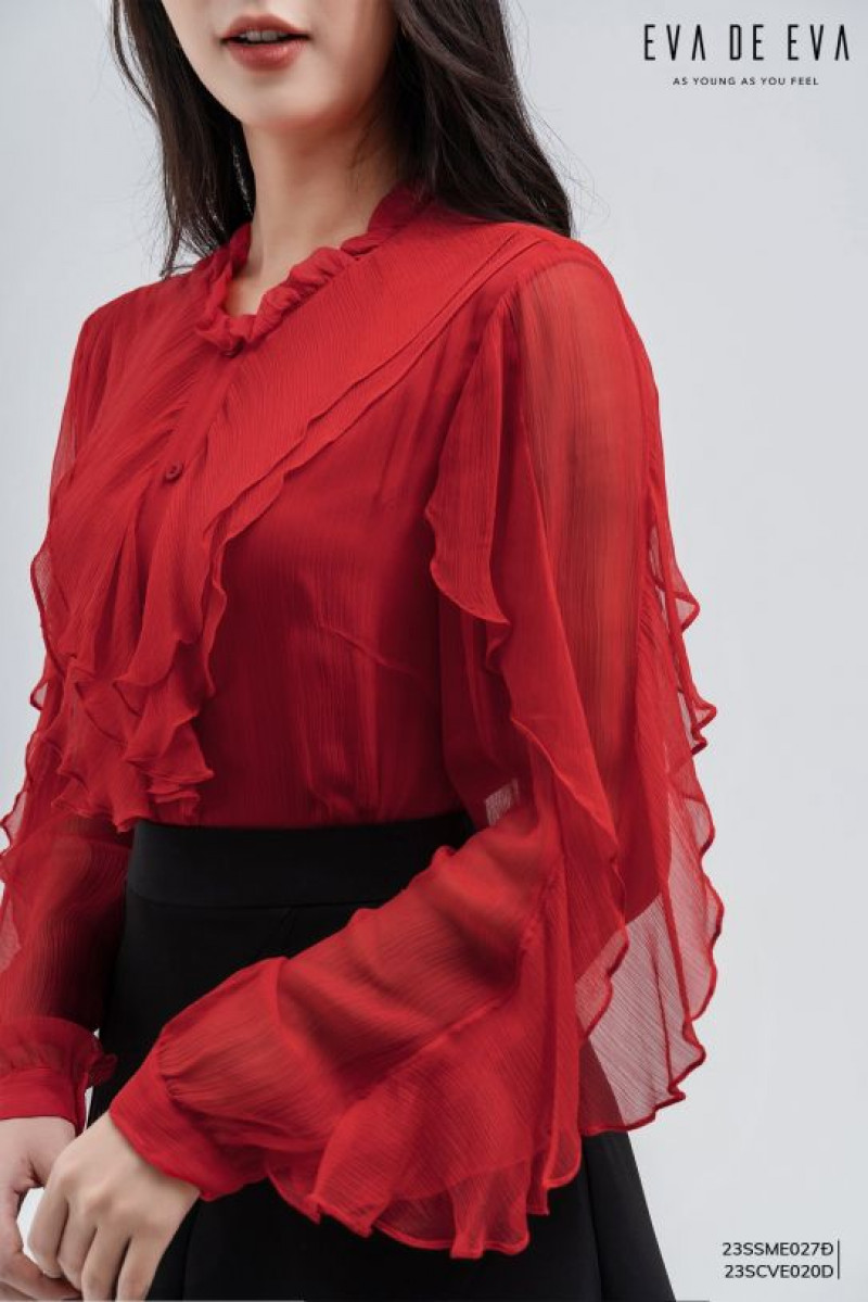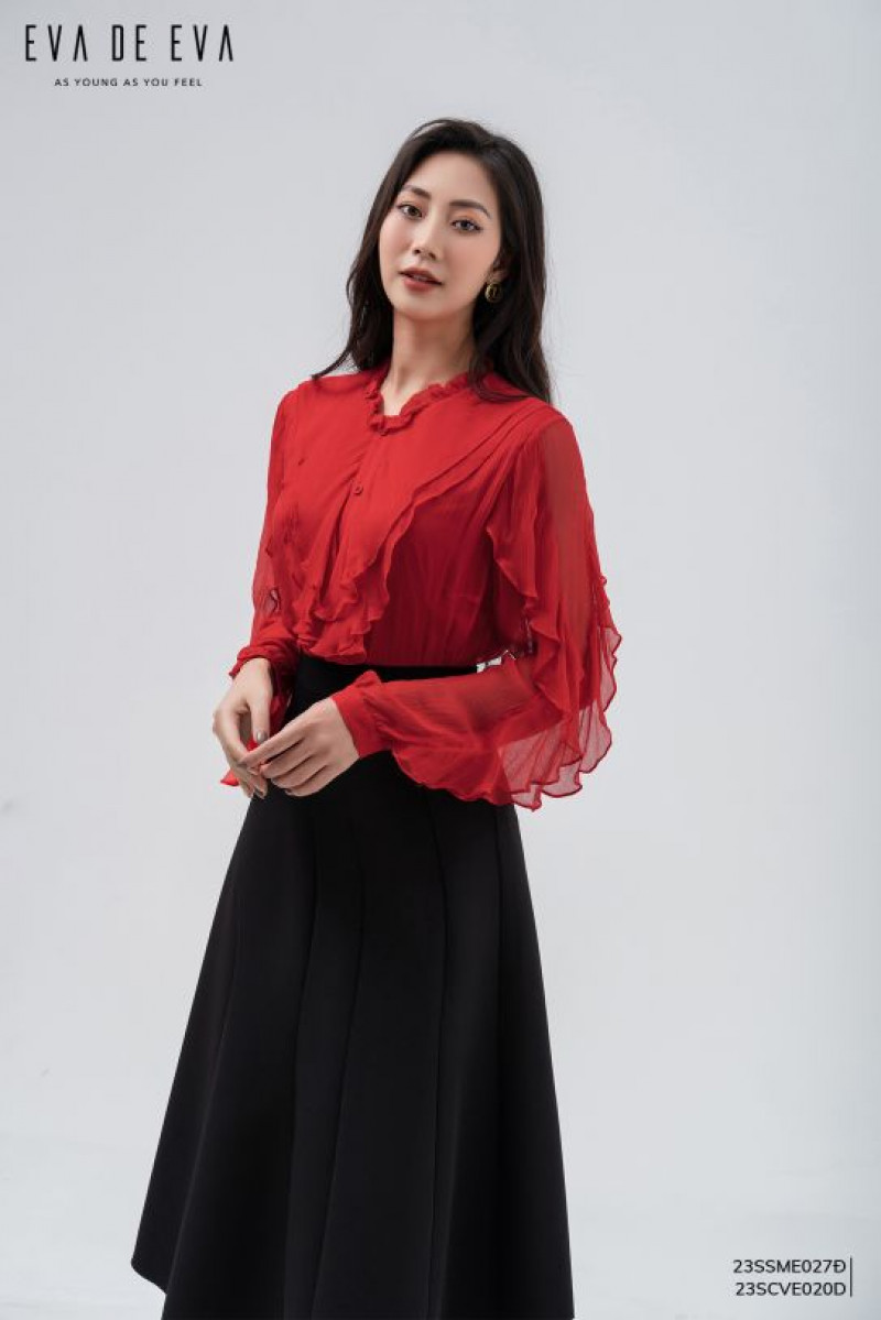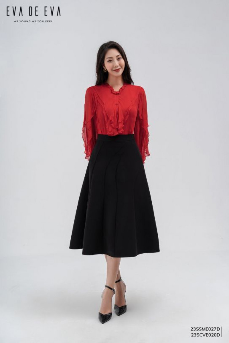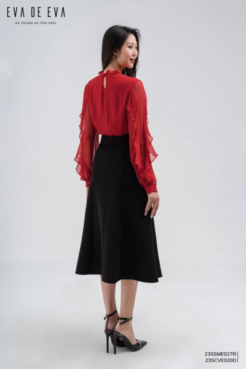 Chân váy midi dáng xòe, chiều dài váy qua đầu gối, có điểm nhấn chiết ly.Màu sắc: Đen