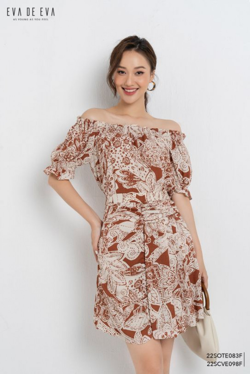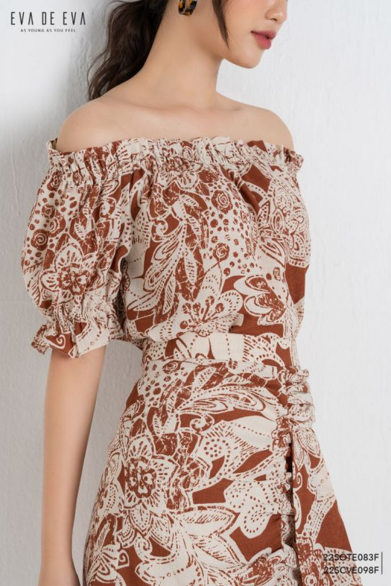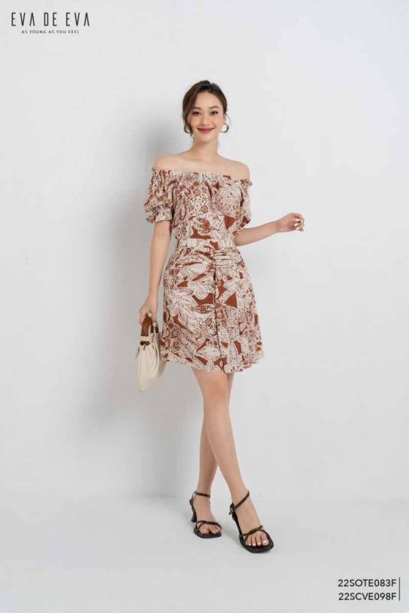 Chân váy midi, dáng A ,đường can giúm giữa,vặn xoắn bất đối xứng.Màu sắc: Họa tiết