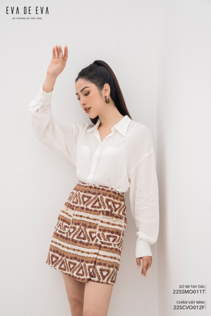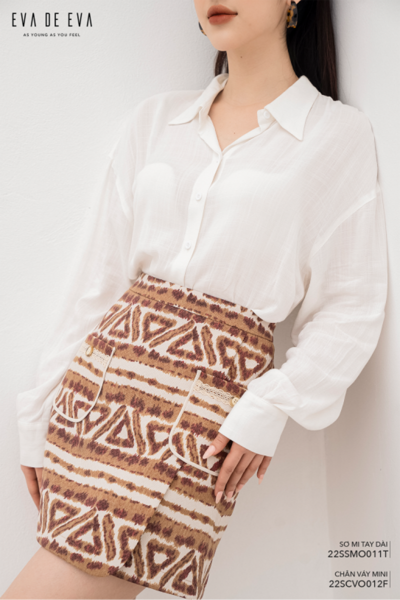 Chân váy ngắn, phom dáng chữ A, có khóa kéo, chi tiết 2 túi tiện dụng.