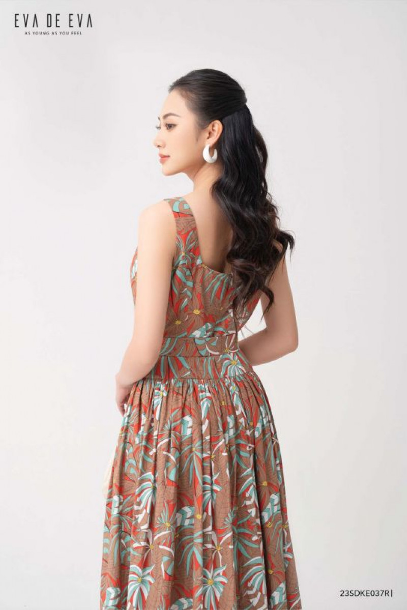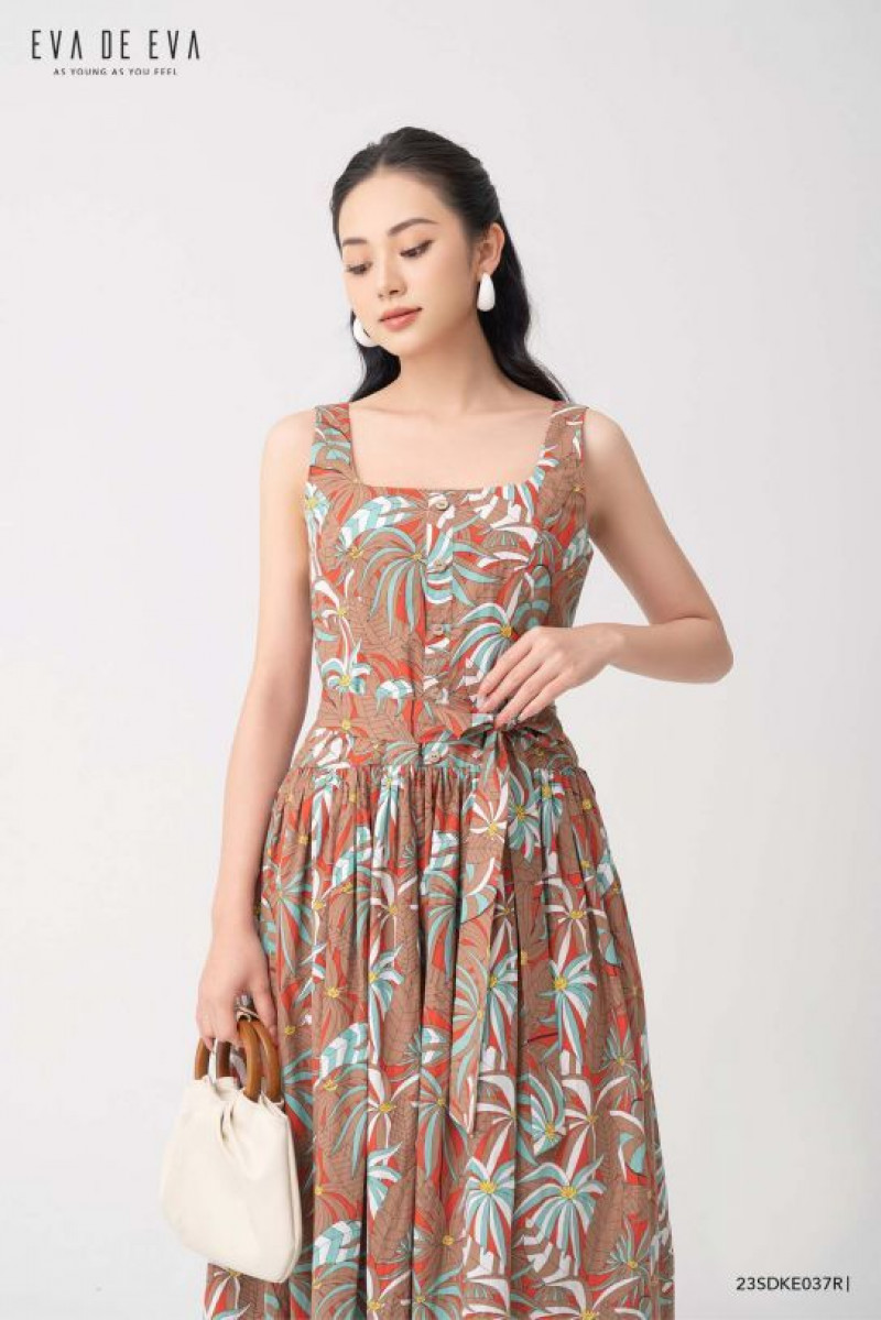 Đầm hai dây, cổ vuông, chi tiết thắt eo tạo điểm nhấn, phần thân dưới xòe rộng, họa tiết tropical nổi bật.