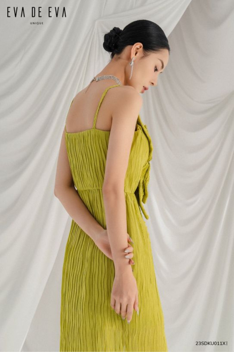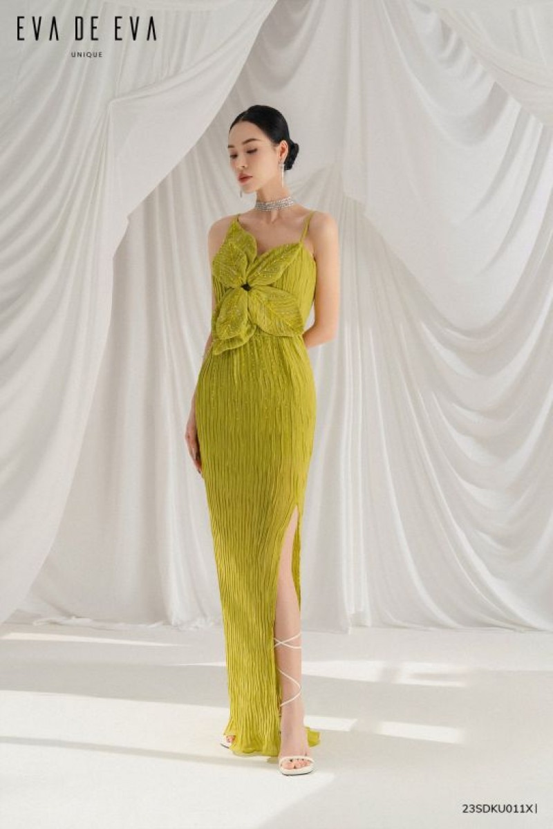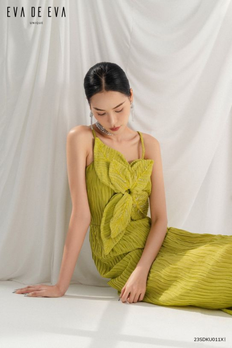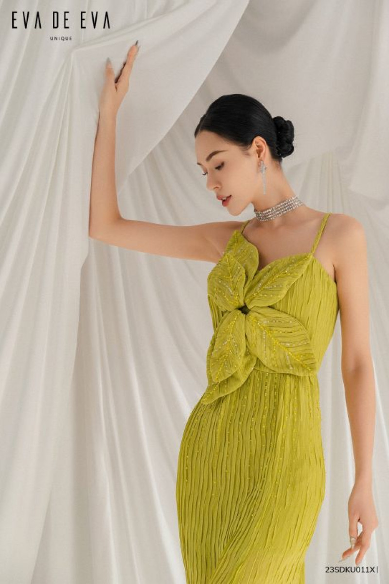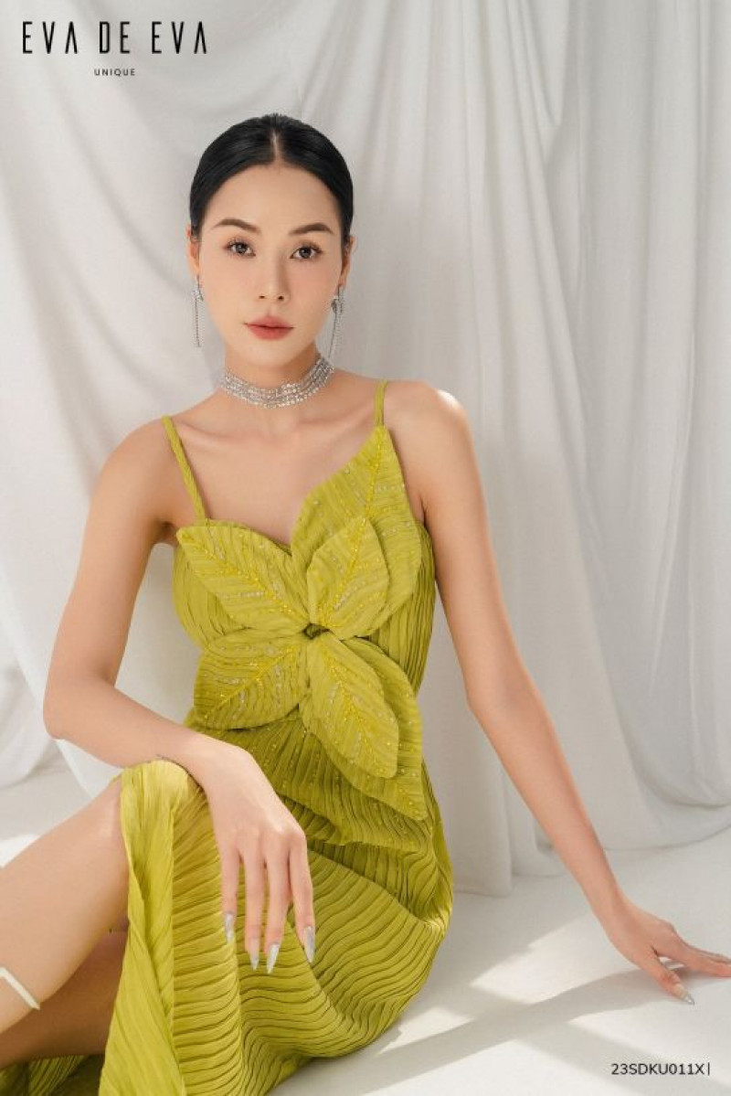 Đầm hai dây ôm eo suông thẳng có đường cắt ngang eo, hoa được làm bằng vải chính tạo điểm nhấn, phần thân dưới suông dài có xẻ lệch một bên.Màu sắc: Xanh