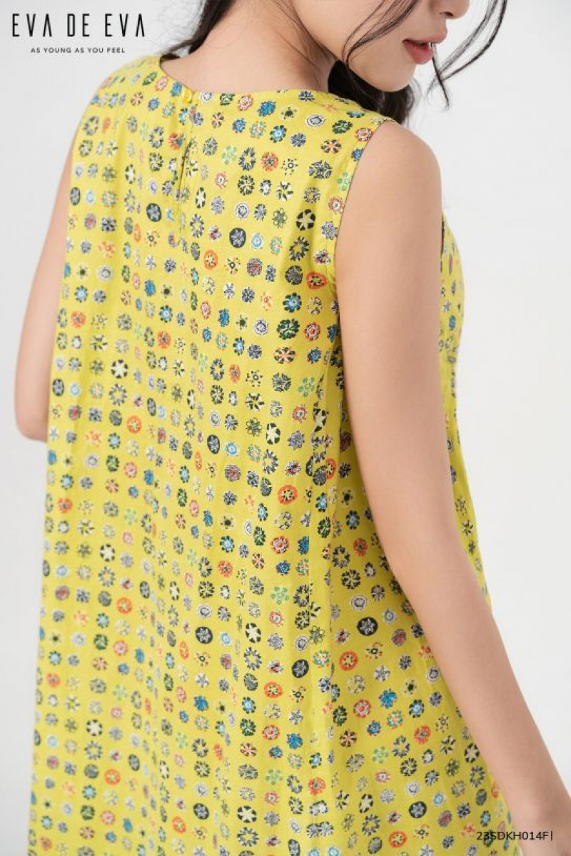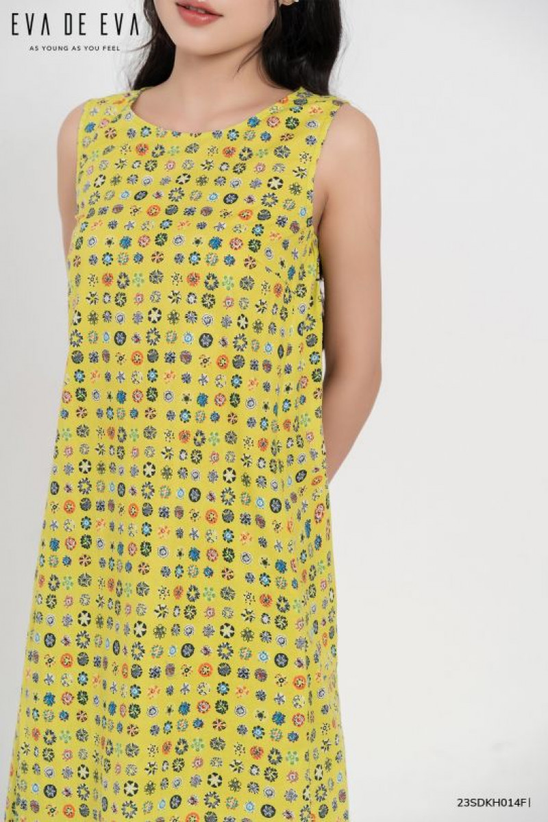 Đầm sát nách, dáng suông, họa tiết hoa bắt mắt, phù hợp để mặc đi chơi cuối tuần.