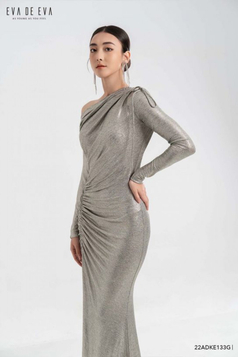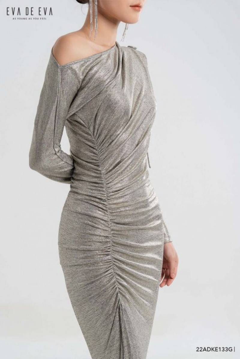 Đầm tay dài, phom dáng ôm body, trễ vai cùng với các điểm nhấn hông tinh tế.