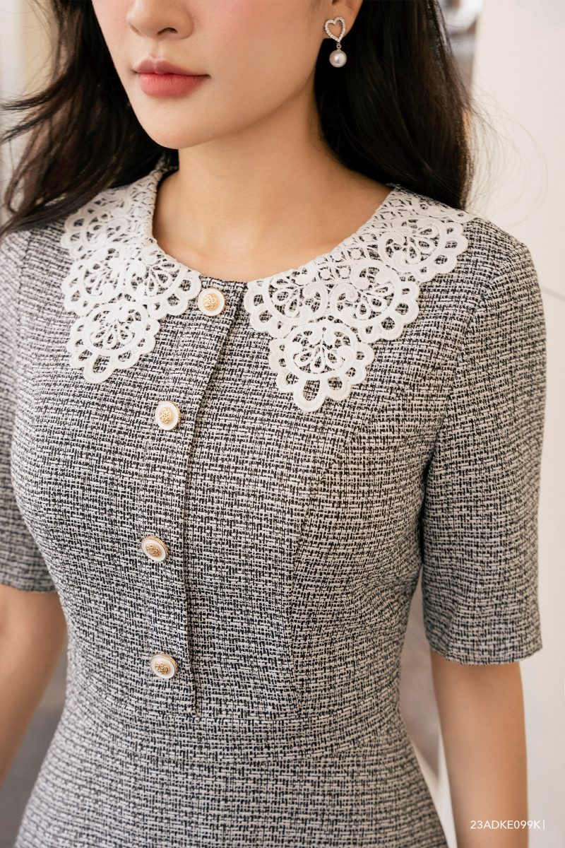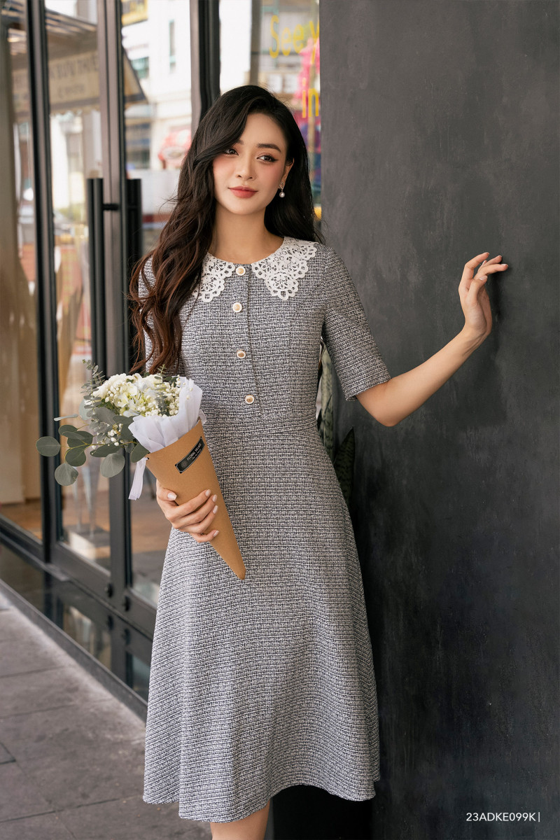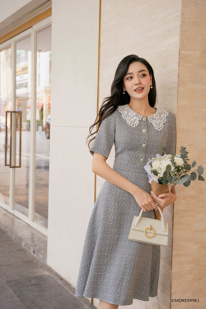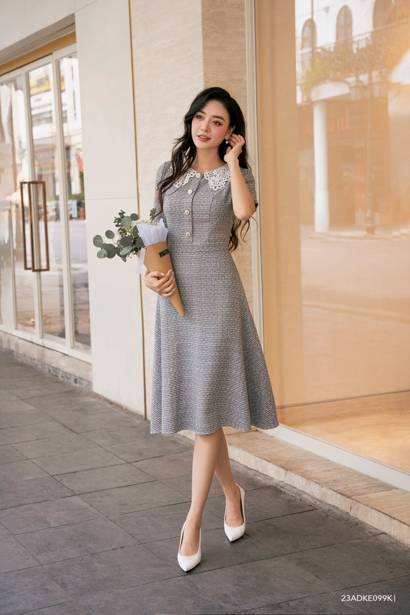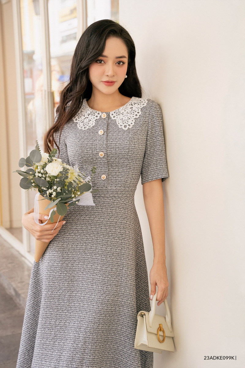 Đầm tay ngắn, dáng xòe nhẹ nữ tính, cổ phối kiểu cách điệu