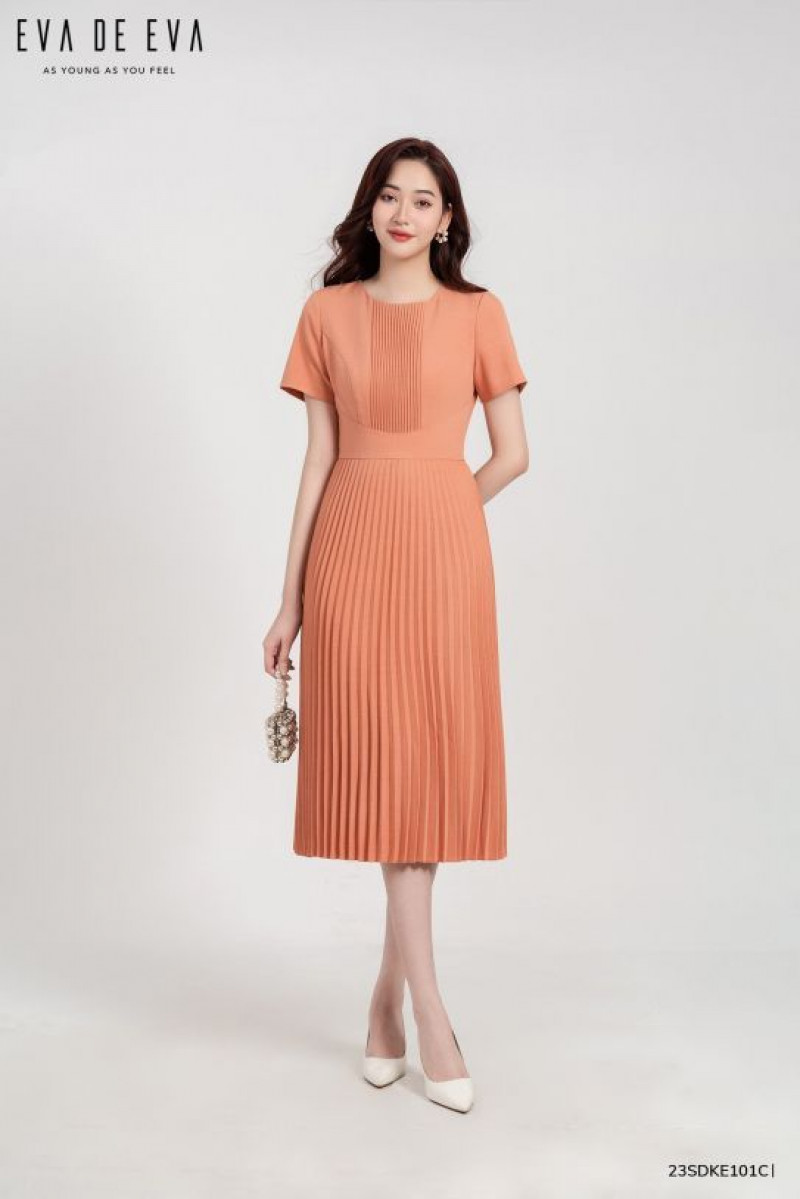 Đầm tay ngắn dáng midi, thân váy xếp ly nữ tính