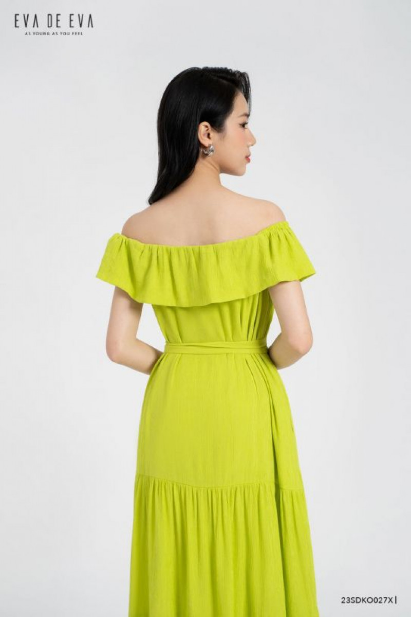 Đầm trễ vai bèo nhún, dáng suông có đai thắt eo tạo điểm nhấn, chân bèo nhún xếp tầng.