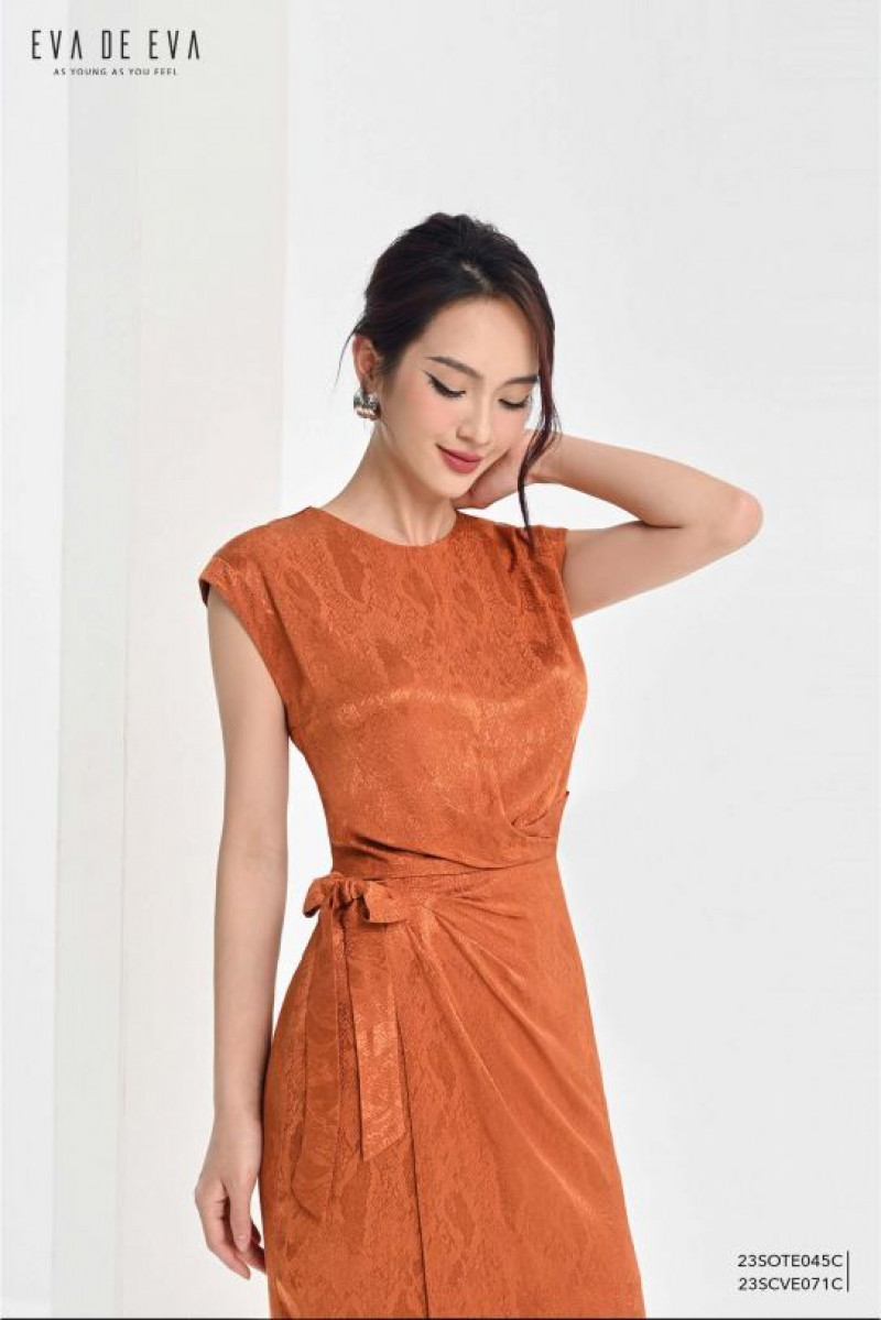 Chân váy midi, phom dáng ôm, chi tiết wrap vặn xoắn bất đối xứng tạo điểm nhấn