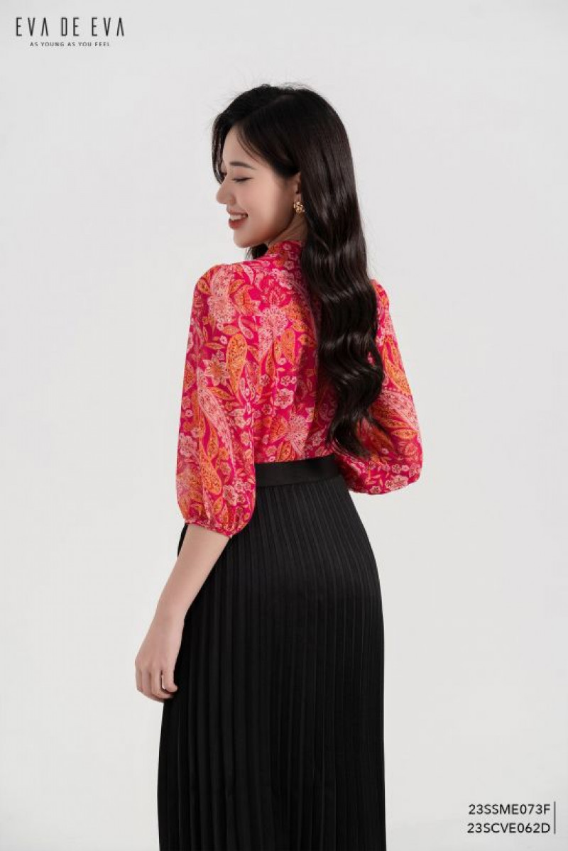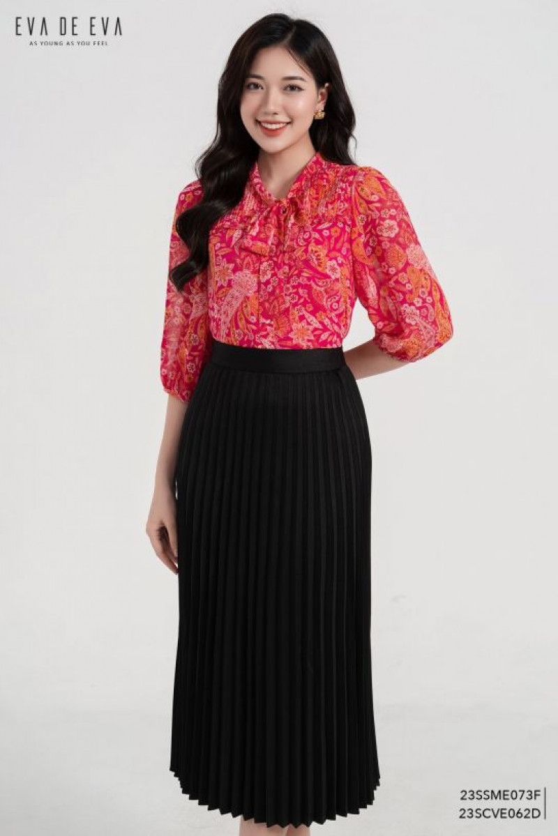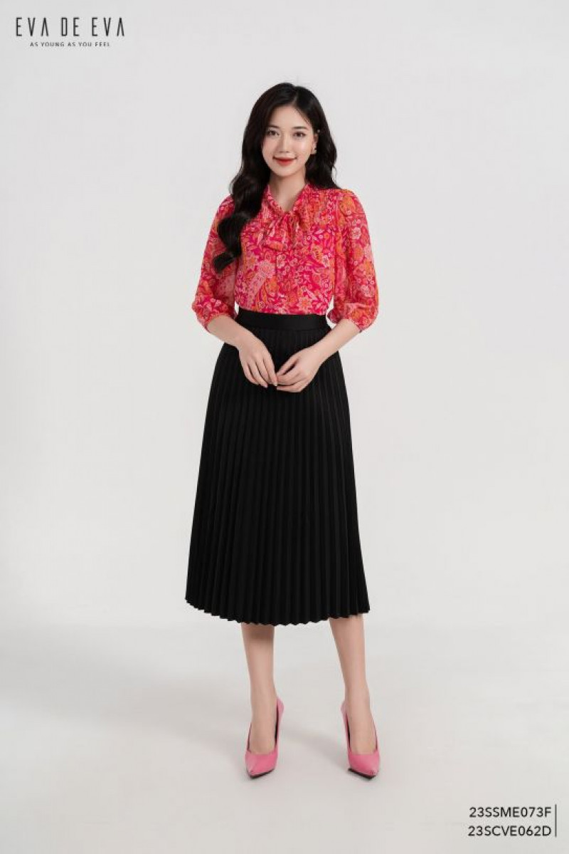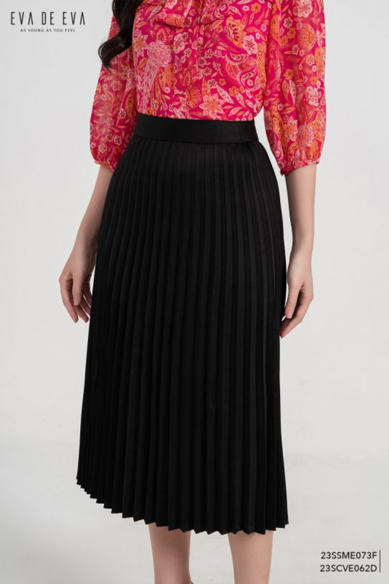 Chân váy dài qua gối xếp ly, dáng suông, có khóa kéo.