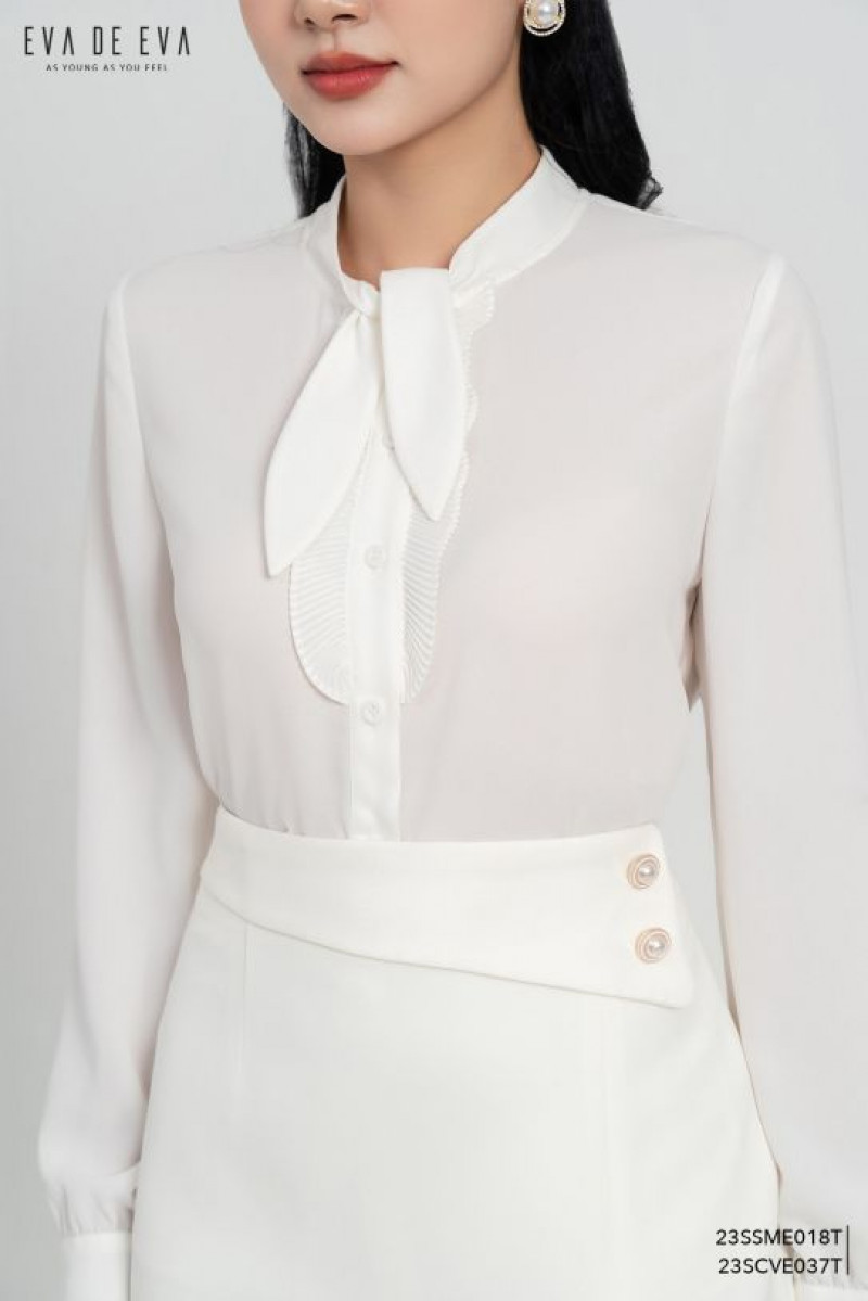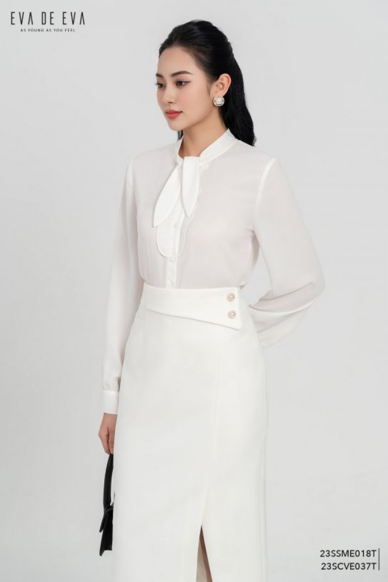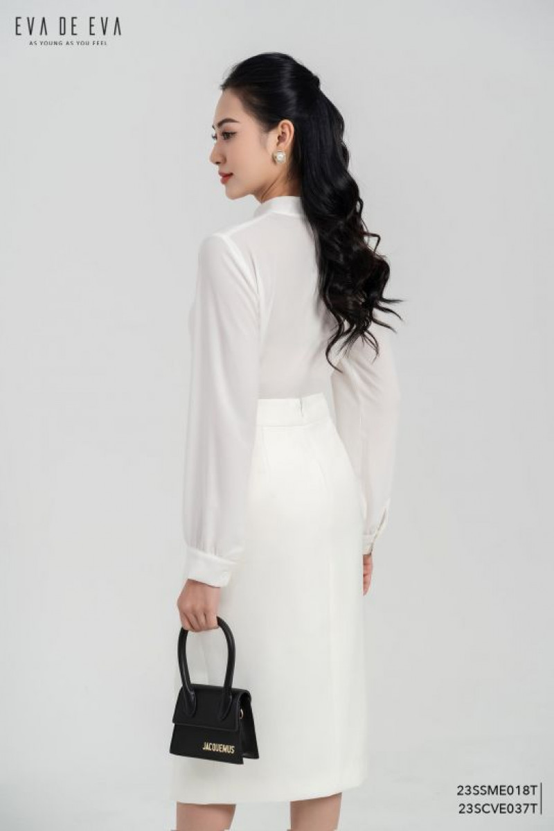 Chân váy bút chì dáng ôm, dài qua gối, xẻ thân trước, cạp đính cúc trang trí.