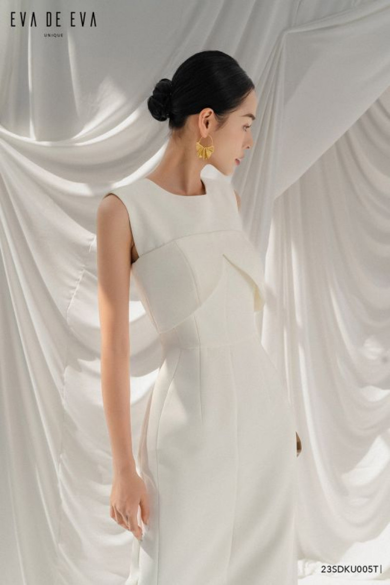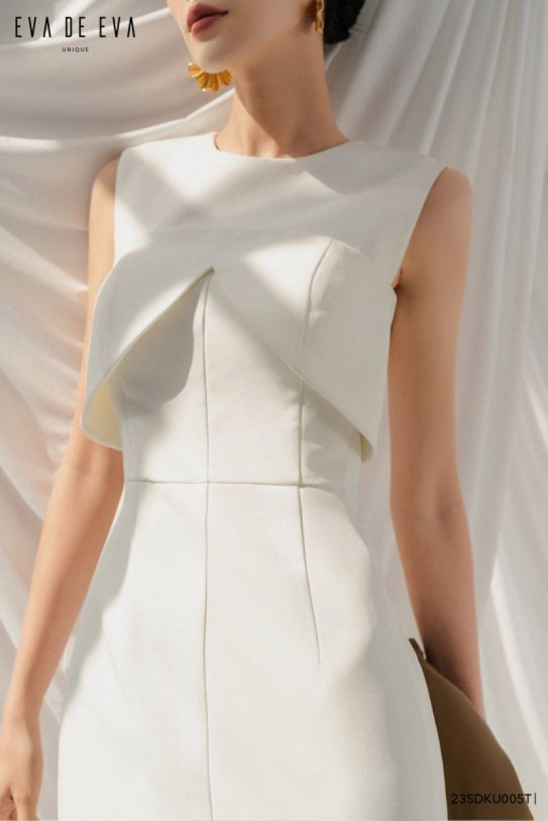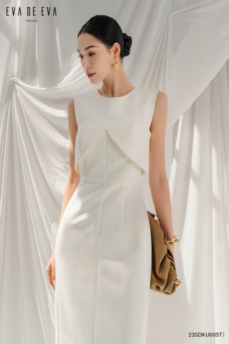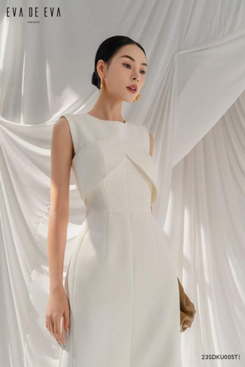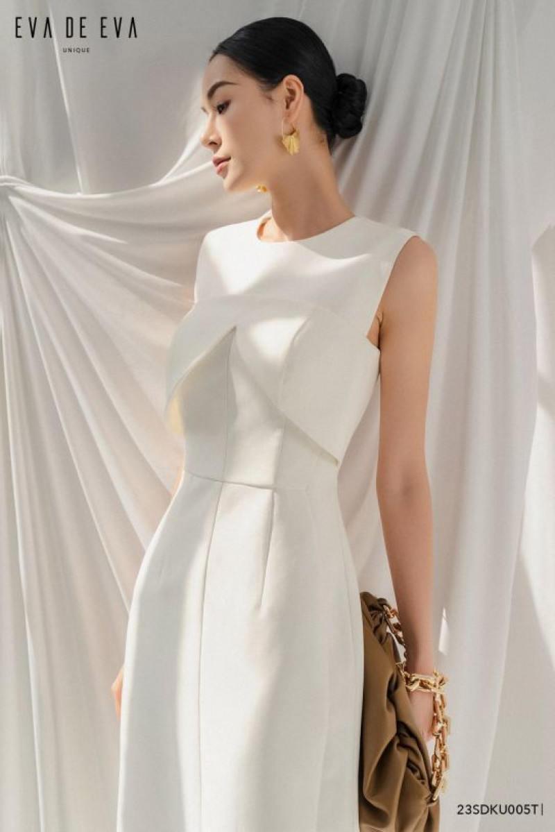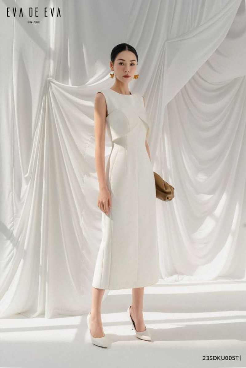 Đầm chi tiết cúp ngực, cổ tròn khít, tay sát nách, kéo khóa sau, dáng ôm midi, xẻ sau.