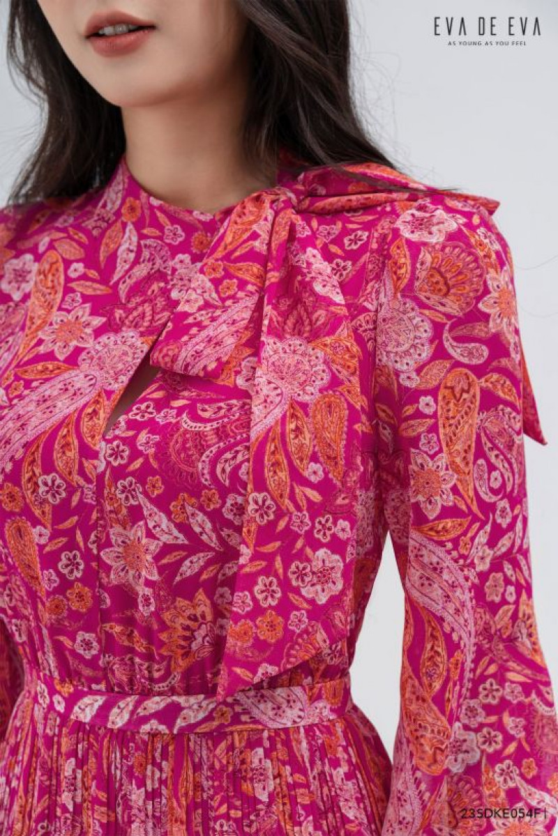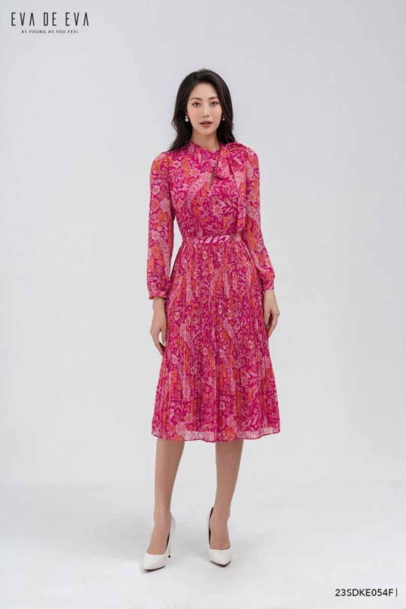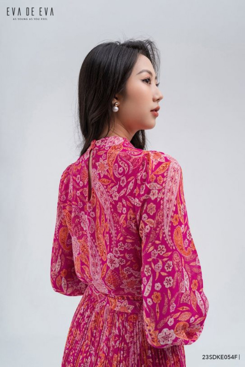 Đầm tay dài, dáng xòe nhẹ, màu sắc họa tiết nổi bật