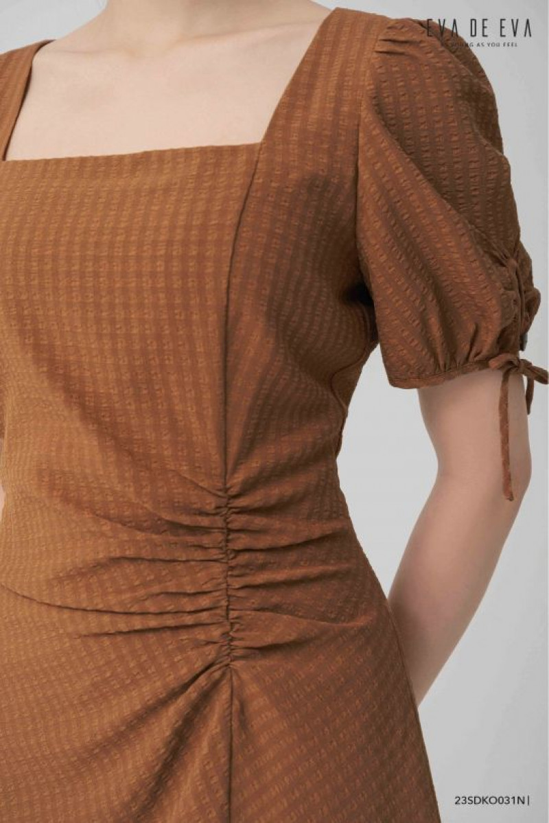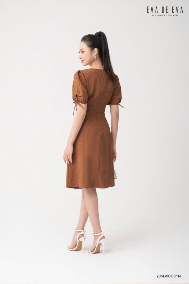 Đầm tay ngắn, dáng thắt eo, cổ vuông, tay bồng nhẹ, có chi tiết xẻ tròn nhúm và nơ trang trí.