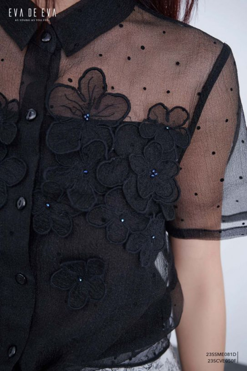 Sơ mi tay ngắn, phom dáng suông basic, có chi tiết vạt buộc phía trước trẻ trung, trang trí đính hoa thêu và đính hạt lấp lánh.
