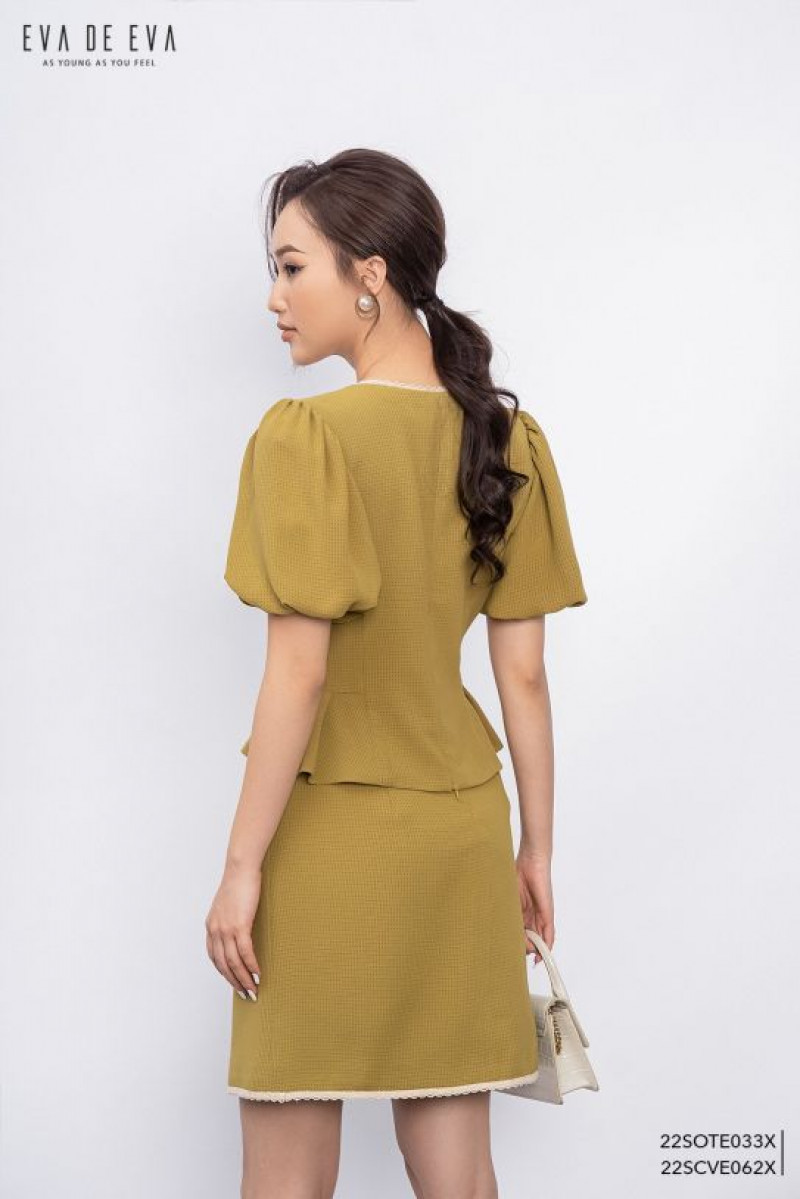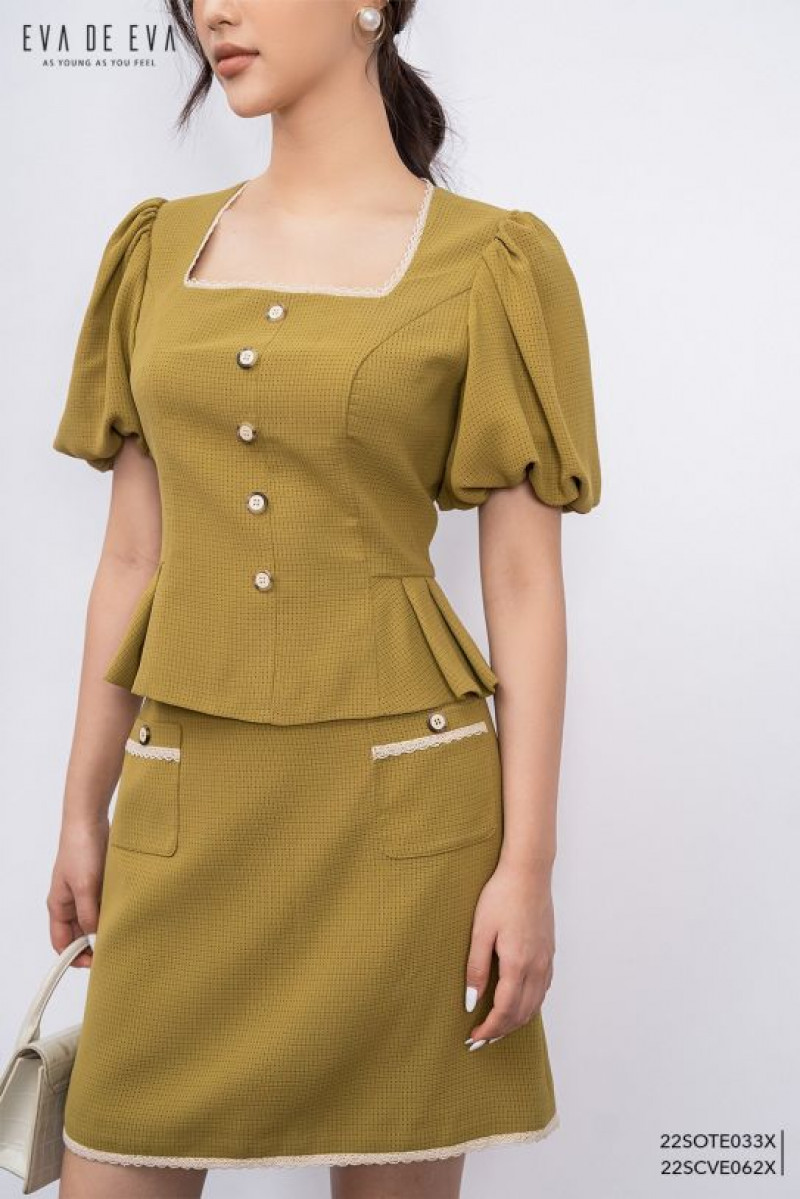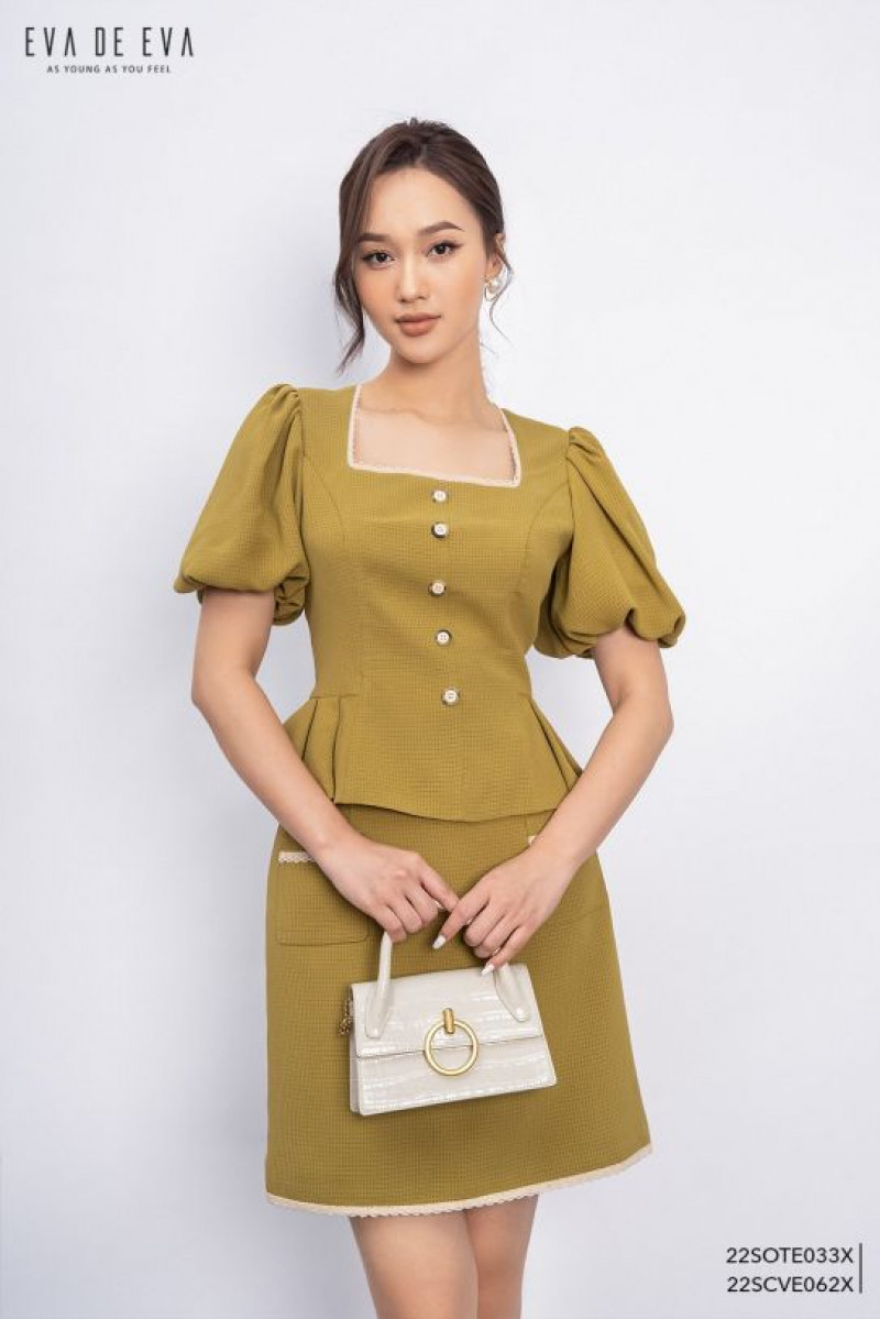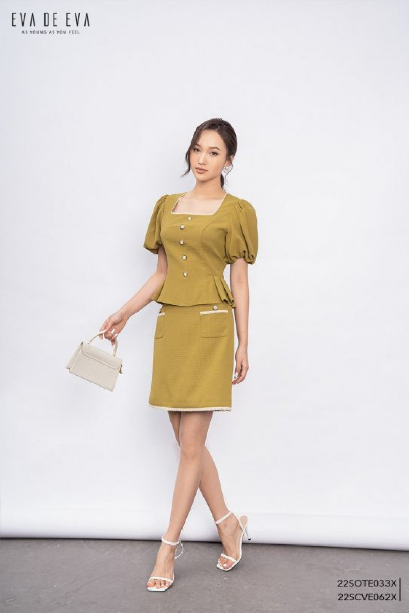 Chân váy ngắn, phom dáng A, kết hợp với áo kiểu