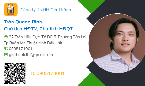CEO Trần Quang Bình đang sinh sống và làm việc tại Đắk Lắk. Anh hiện là Chủ tịch HĐTV, Chủ tịch HĐQT Công ty TNHH Gia Thành - doanh nghiệp chuyên xây lắp Công trình điện, Thiết bị điện và công trình hạ tầng giao thông nông nghiệp.