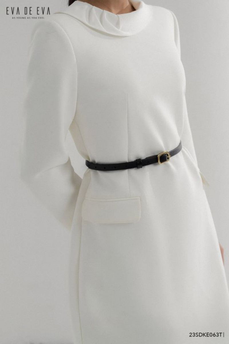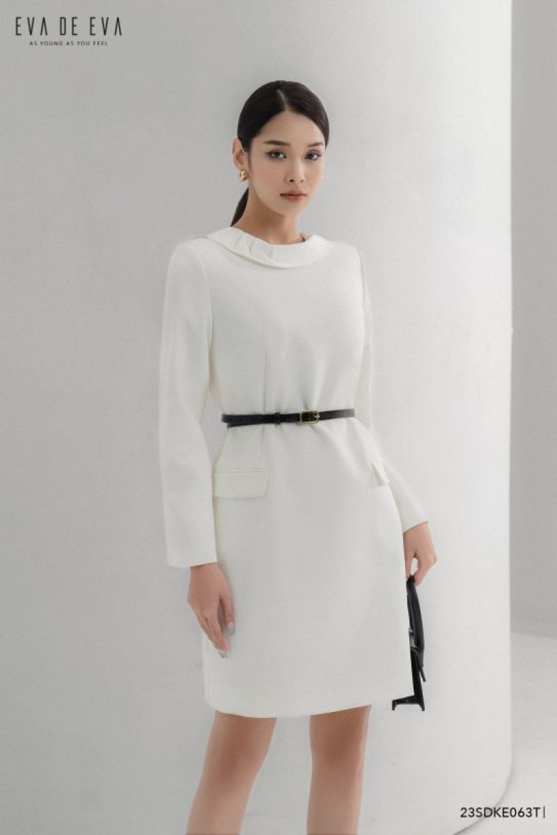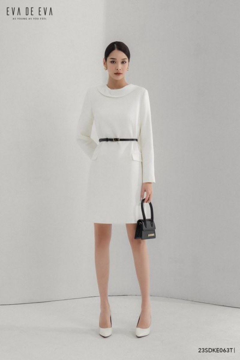 Đầm tay dài, gam màu trắng thanh lịch, có đai thắt eo tạo điểm nhấn