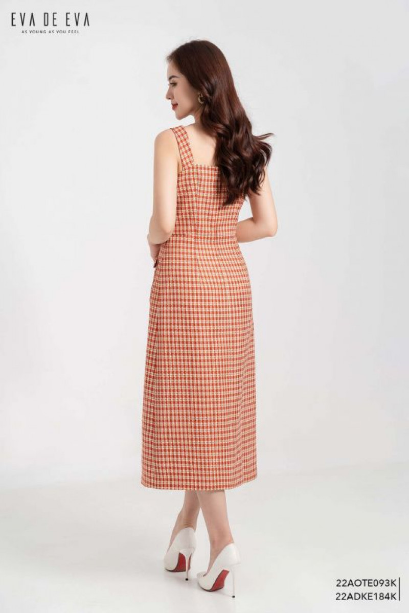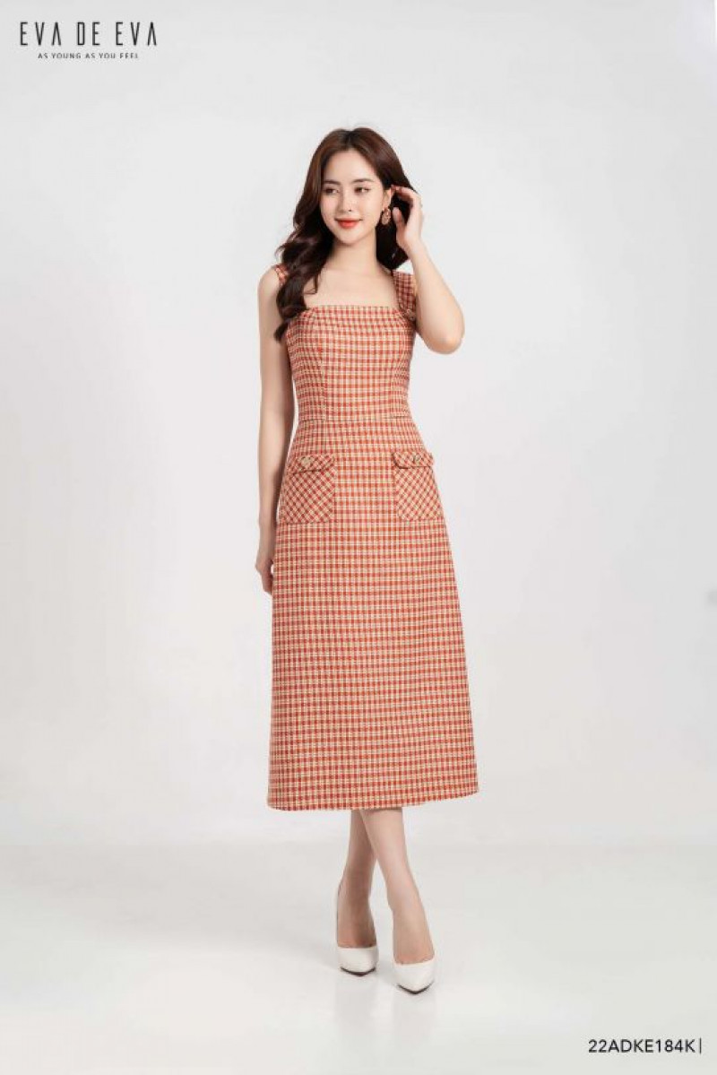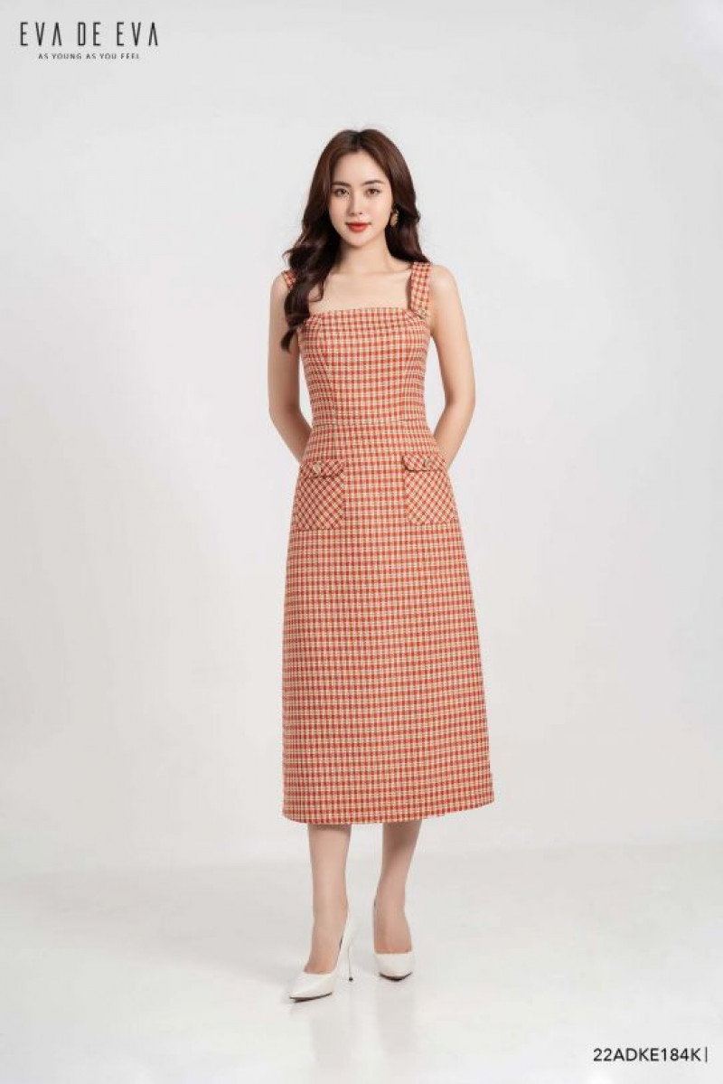 Đầm 2 dây bản to, dáng a thân dưới, túi ốp trang trí.Màu sắc: Kẻ