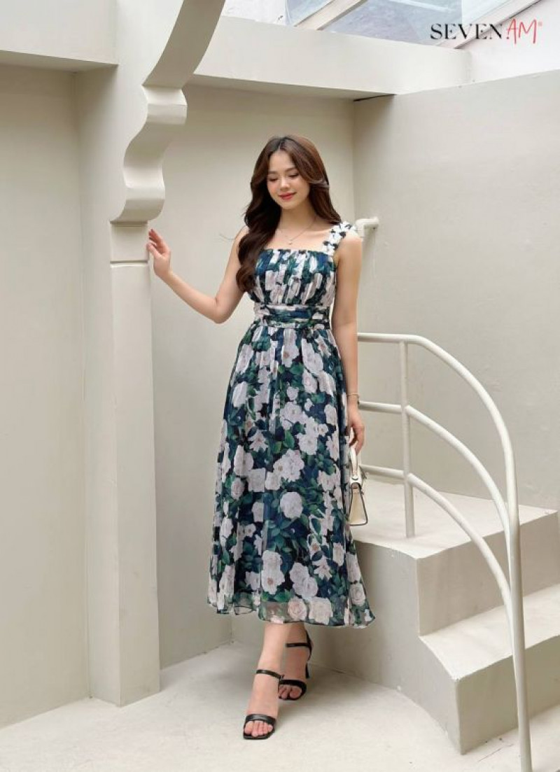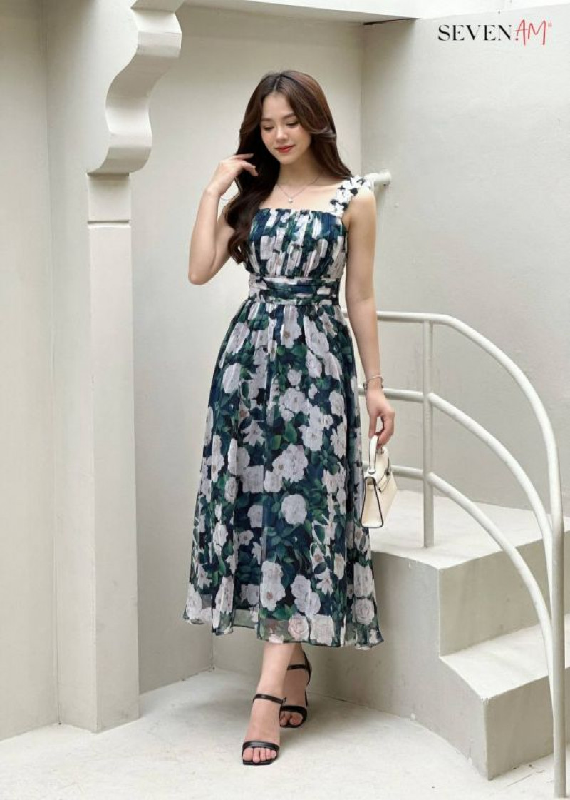Đầm midi 2 dây sifong xanh hoa trắng Seven.AM