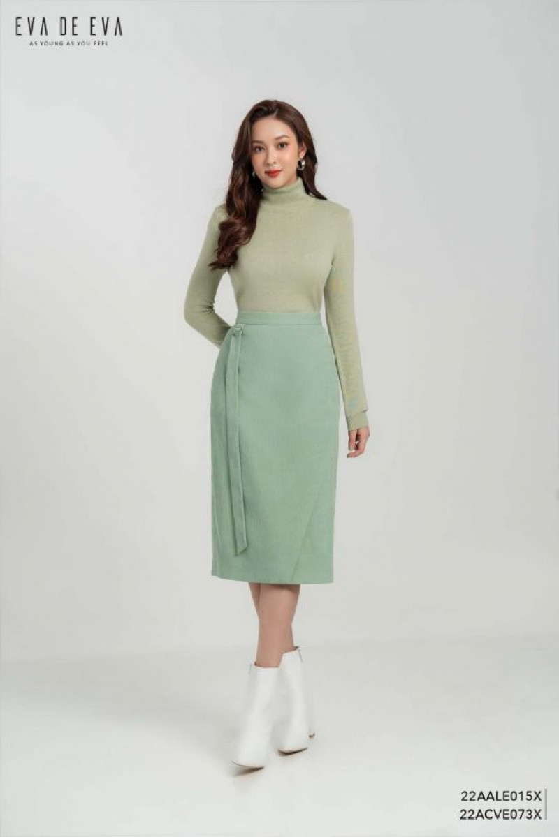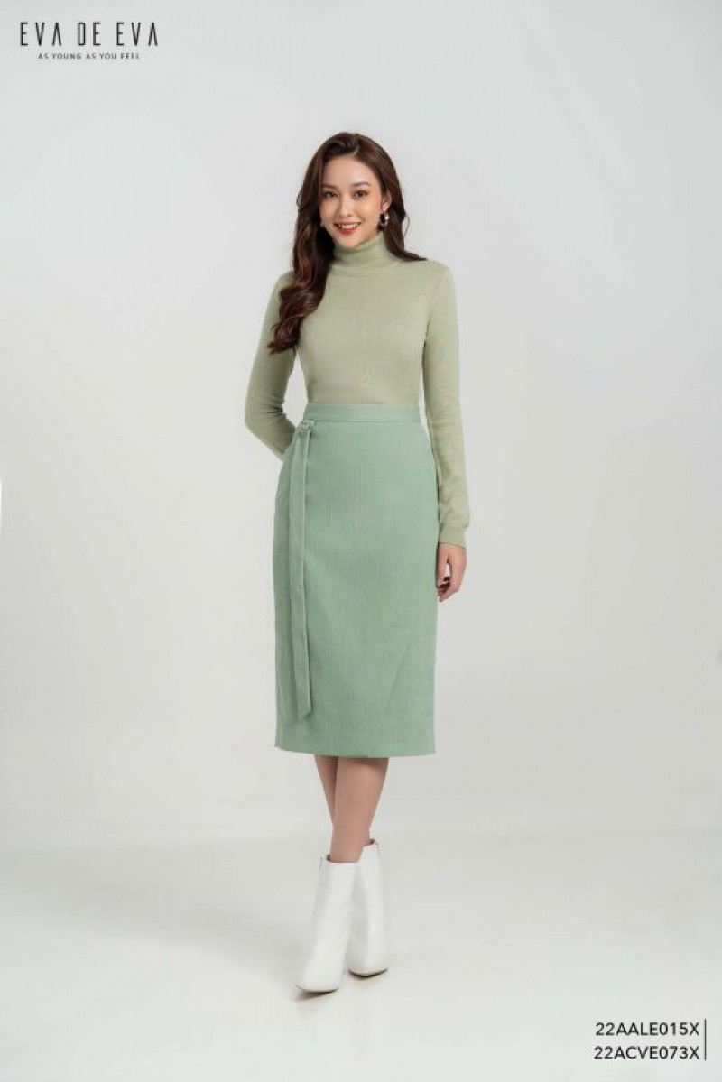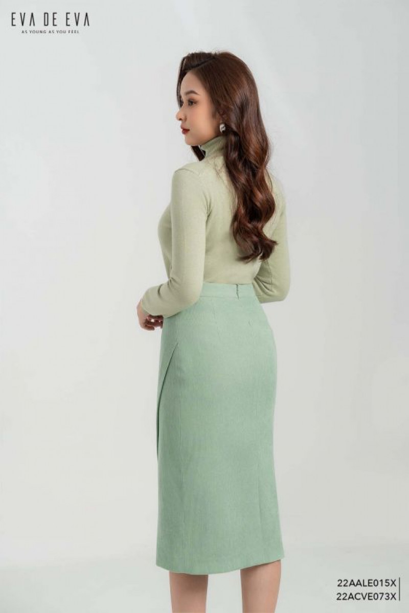 Chân váy bút chì, tà chéo thân trước tạo điểm nhấn, có khóa kéo thân sauMàu sắc: Xanh