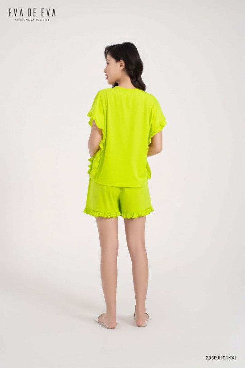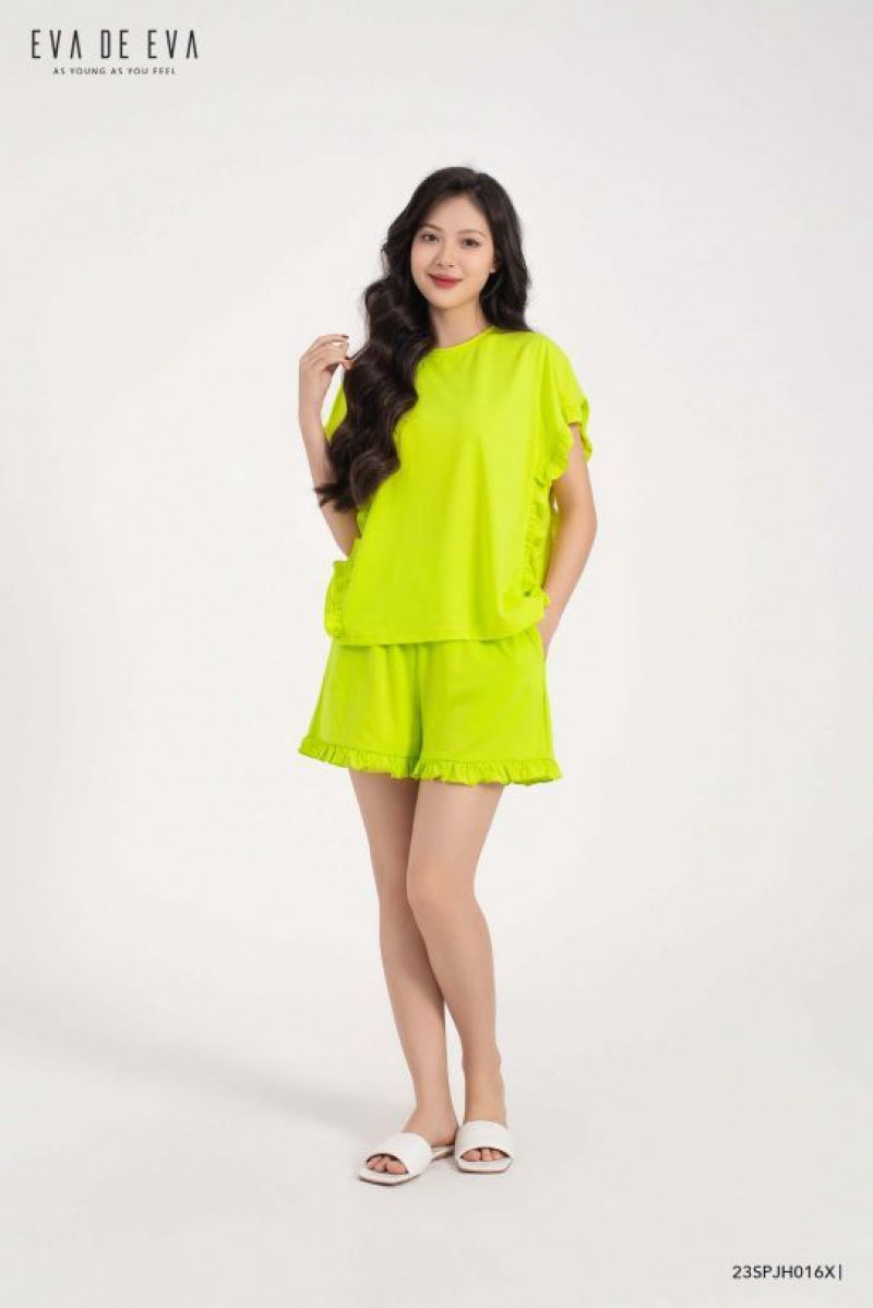 Set Pyjamas, áo ngắn tay kết hợp quần ngắn mát mẻ, viền bèo phối tạo điểm nhấn.