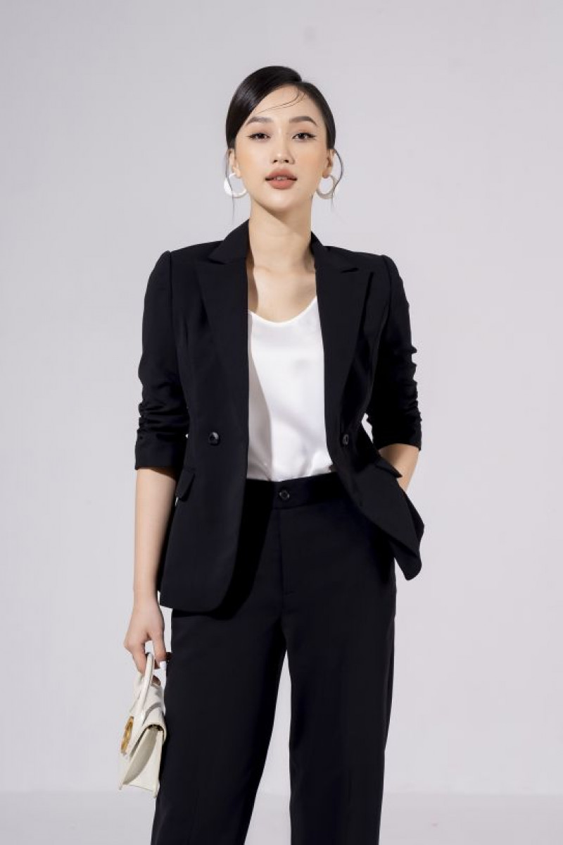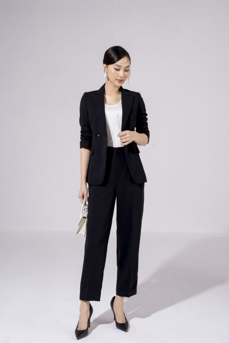 Quần dài ống đứng, có chi tiết khóa kéo và khuy cài.