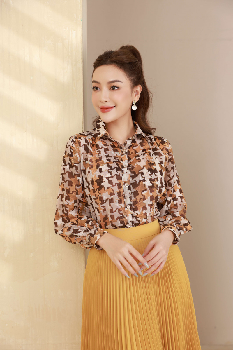 Sơ mi cổ đức họa tiết rúm vai