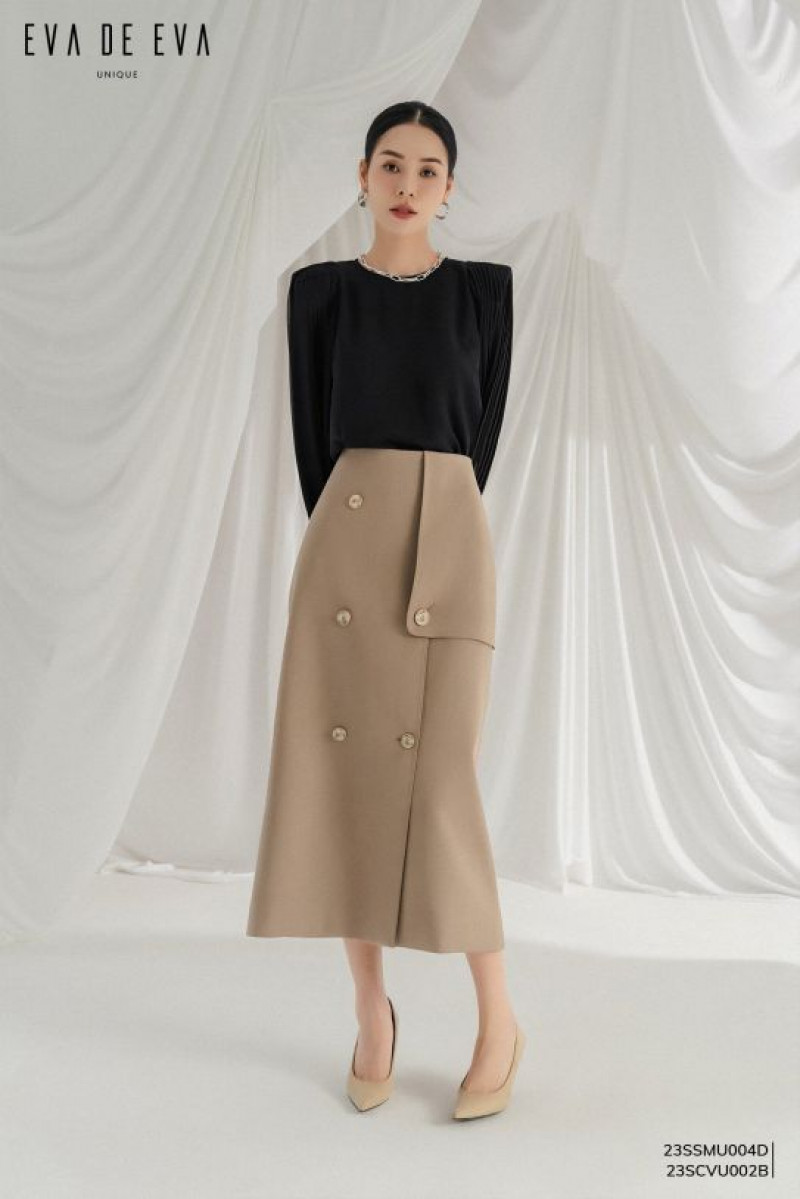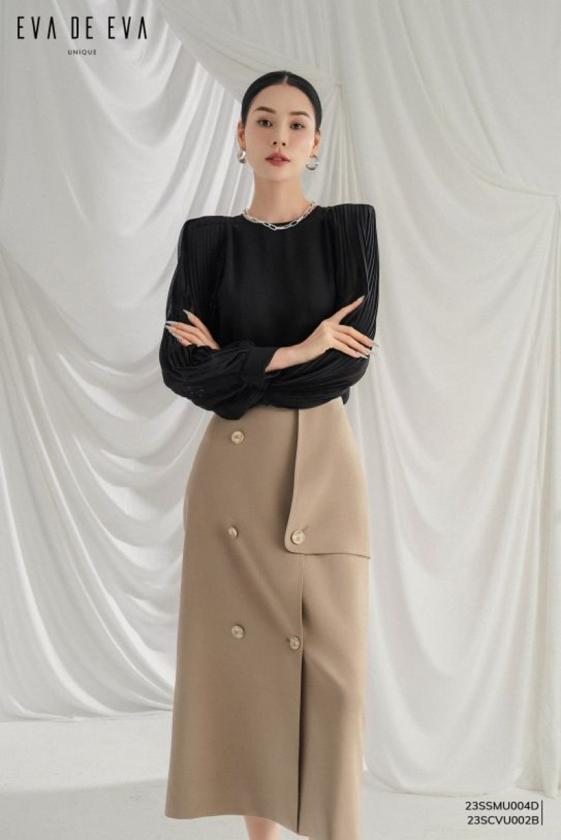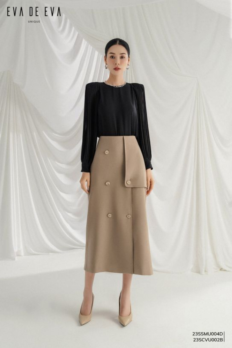 Chân váy A công sở dáng dài midi, 2 hàng cúc, chi tiết lớp ngoài bất đối xứng, kết cấu mới lạ.