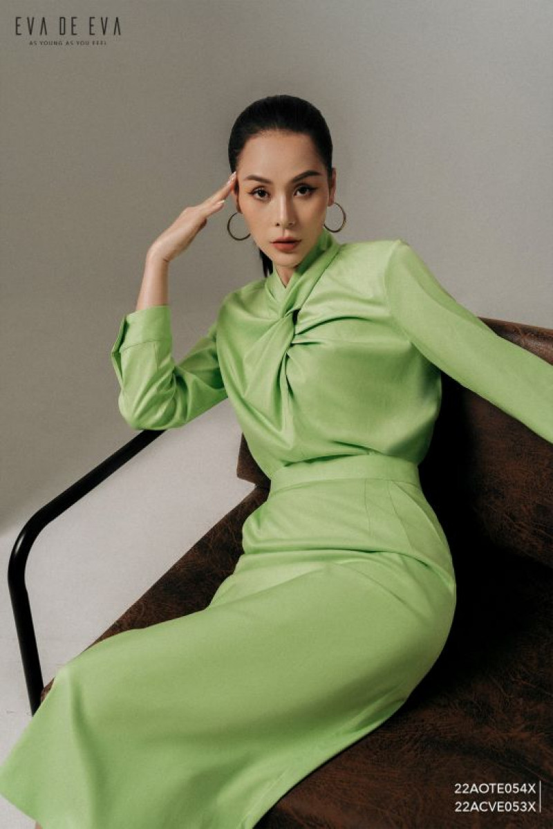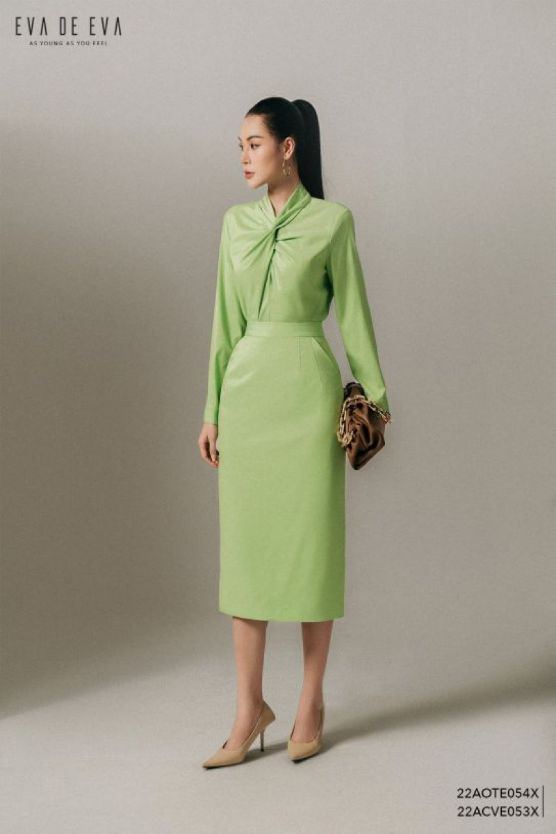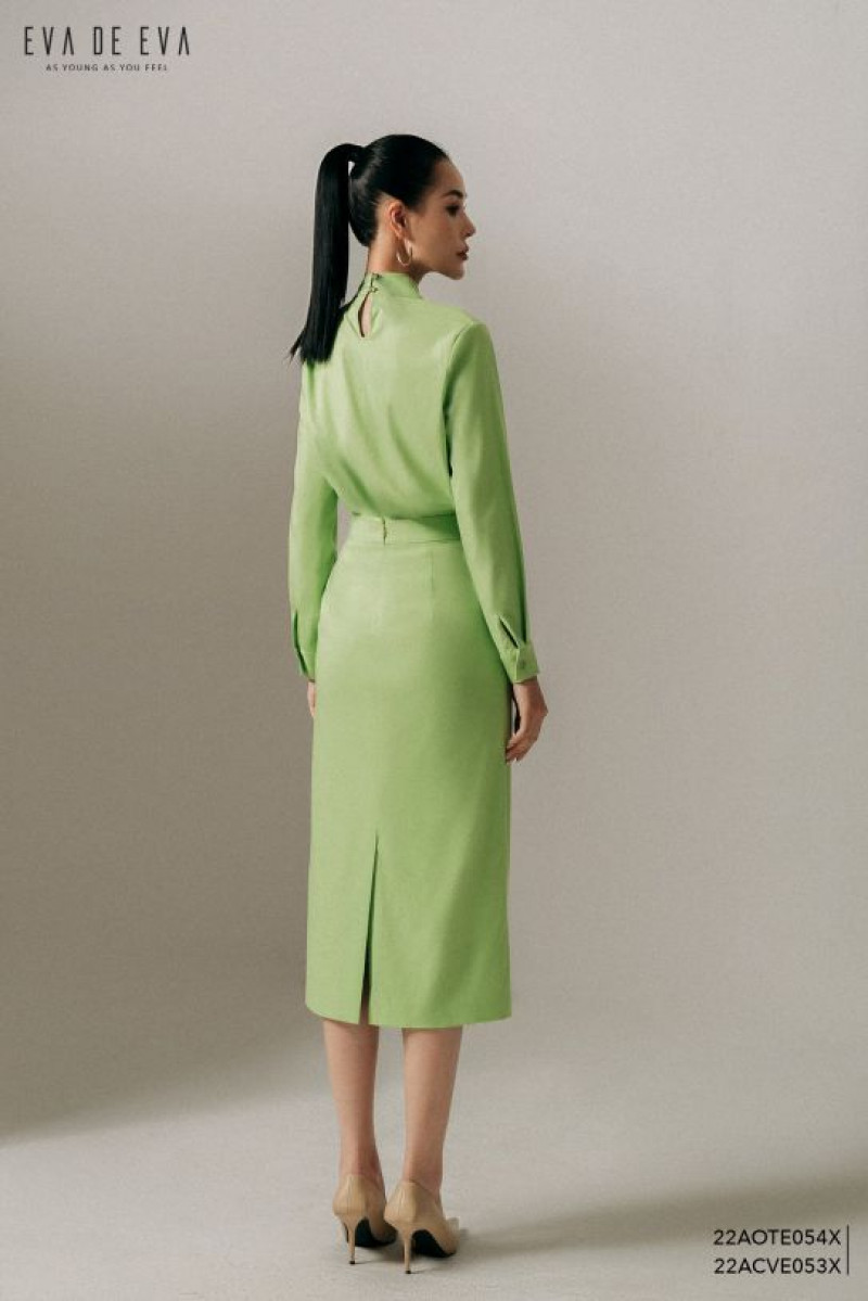 Chân váy suông, dài qua gối, gam màu xanh cốm nhã nhặn Màu sắc: Xanh