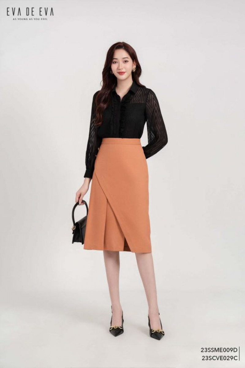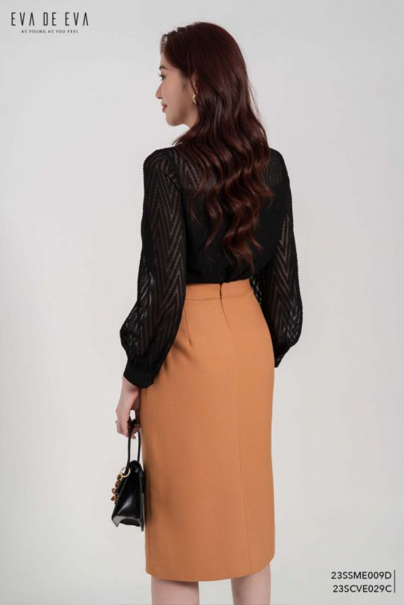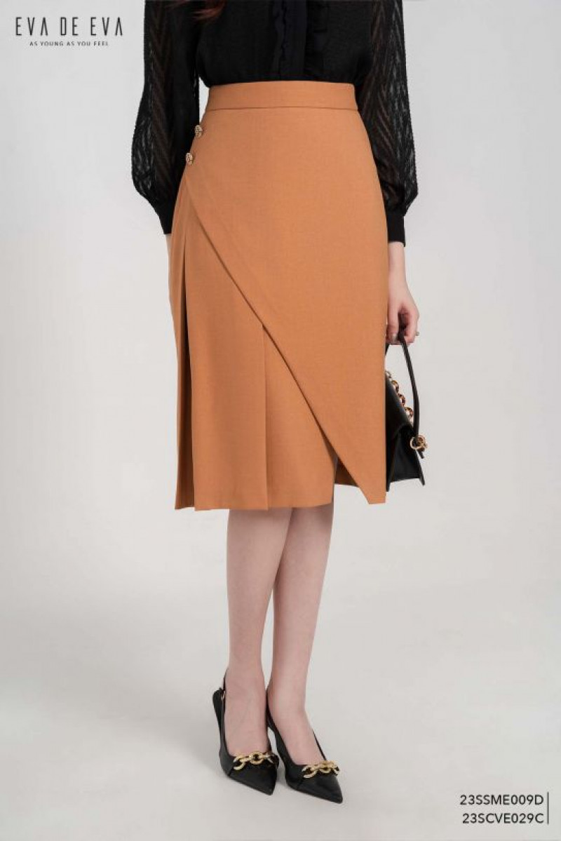 Chân váy dáng bút chì dài, xếp ly bên, tà lệch, 2 lớp, có khóa sau.