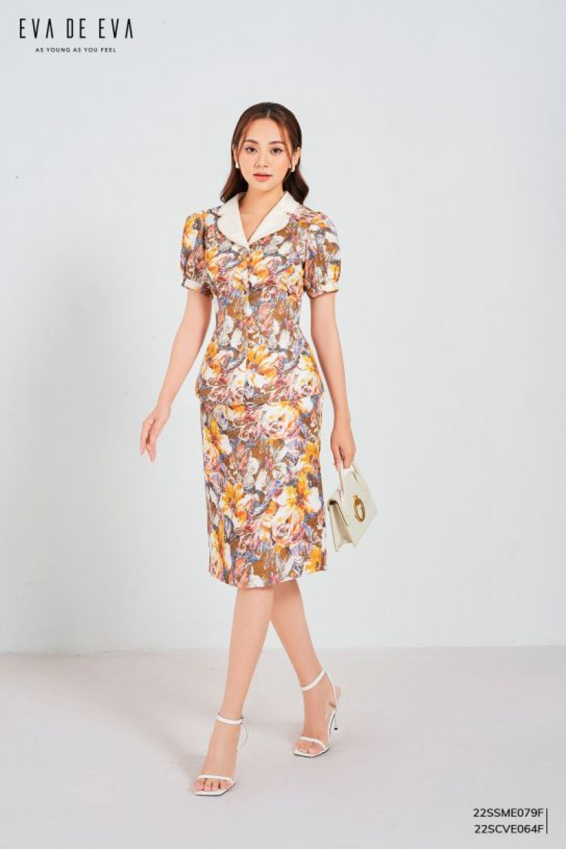 Chân váy ngang gối, phom dáng ôm, họa tiết độc đáo trên nền chất liệu vải Gấm.
