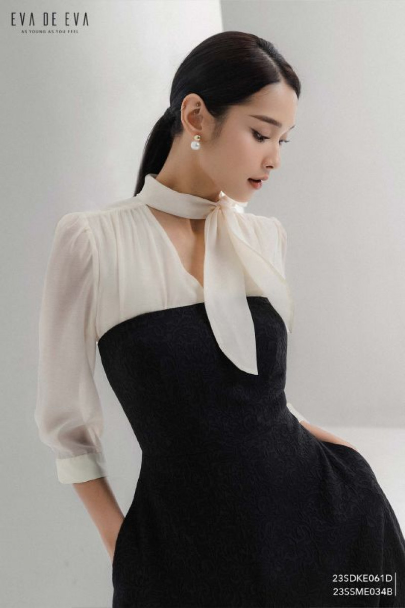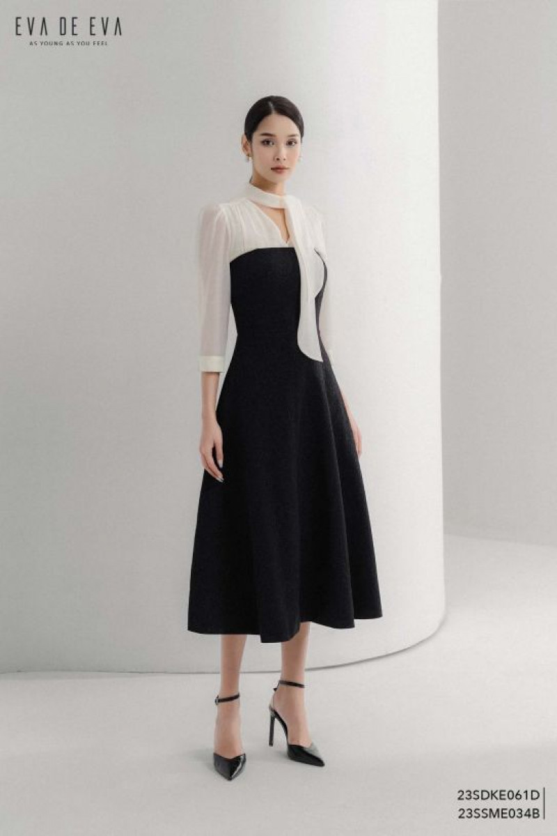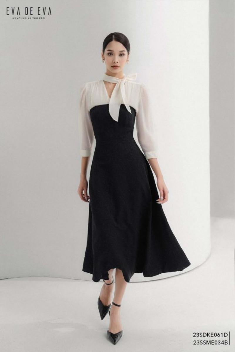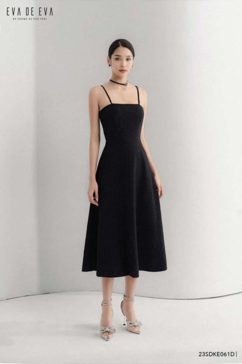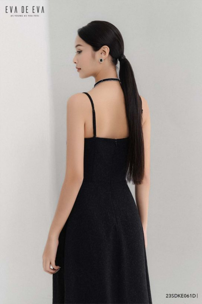 Đầm hai dây, phom dáng xòe A, eo chiết tôn dáng, có đệm ngực và chi tiết dây vai cơi nới có thể tháo rời.