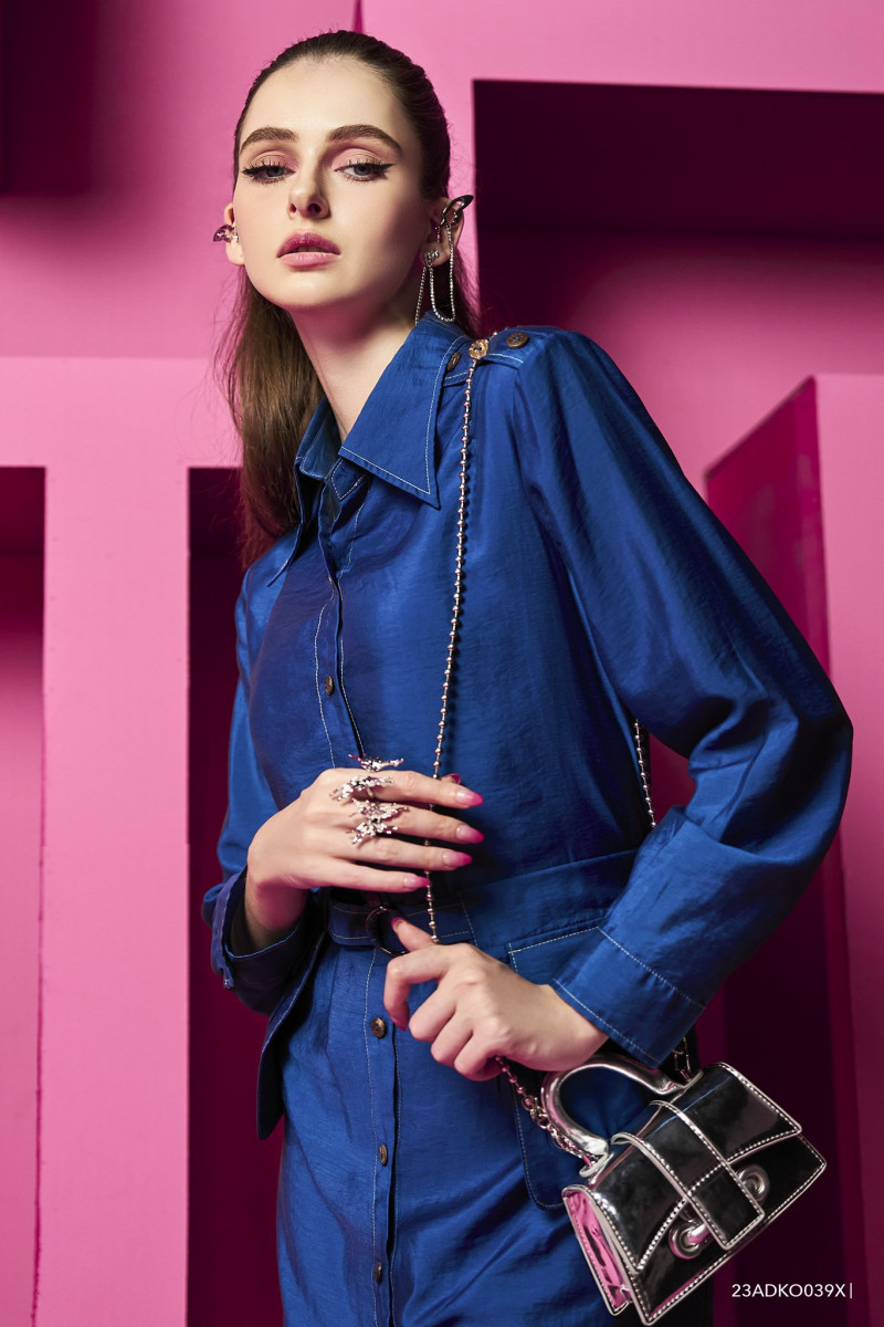 Đầm tay dài, dáng sơ mi, có chi tiết túi độc đáo và đai thắt eo