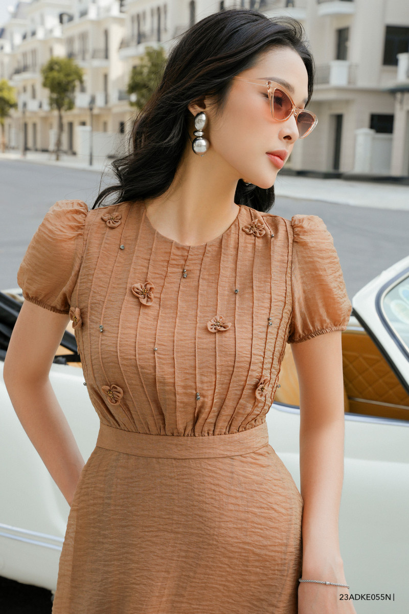 Đầm tay ngắn dáng xòe thắt eo tôn dáng, đính hoa nổi 3D