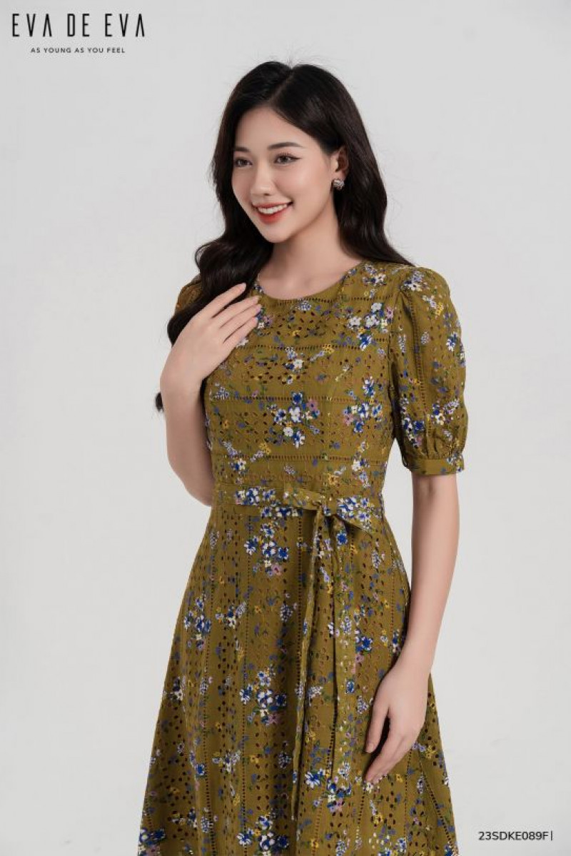 Đầm tay ngắn, dáng thắt eo, cổ tròn, tay nhún nhẹ, kéo khóa sau, đai thắt eo tạo điểm nhấn.