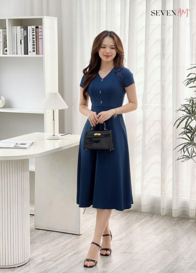 Đầm xòe tay cộc thô xanh xước cổ kiểu đính cúc Seven.AM