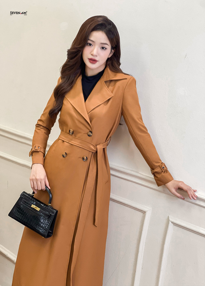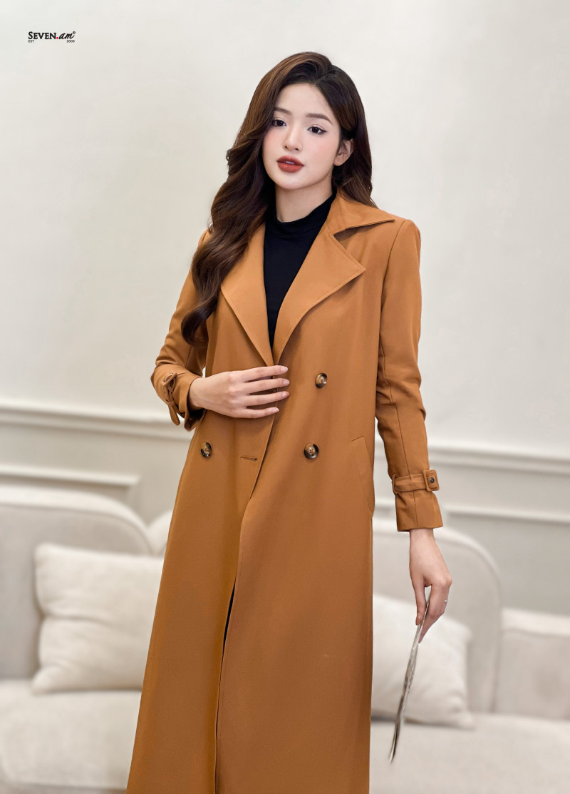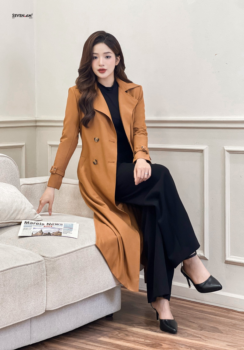 SKU: Áo khoác măng tô dài vàng bò 2 hàng cúc tay dài có đai tay đai eo buộc seven.am+s+cam