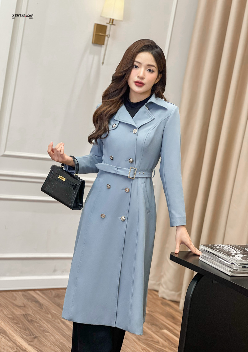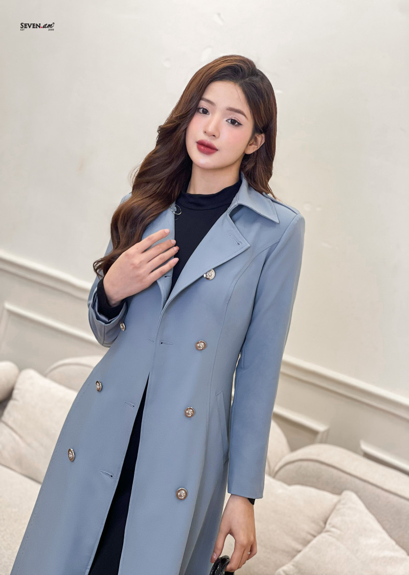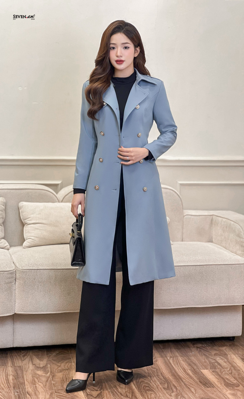 SKU: Áo khoác dài xanh ngọc cổ đức 2 hàng cúc đai dời seven.am+s+xanhblue