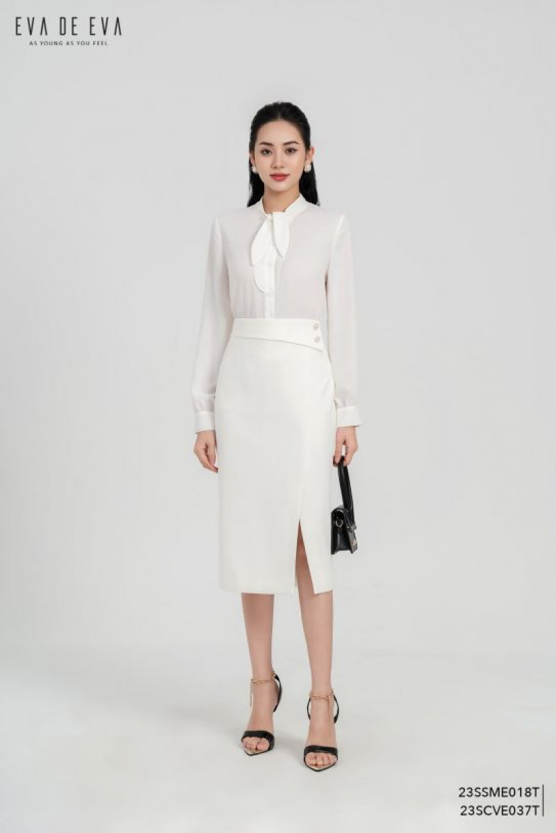Sơ mi tay dài, dáng suông sơ vin, cổ có chi tiết nơ thắt cách điệu
