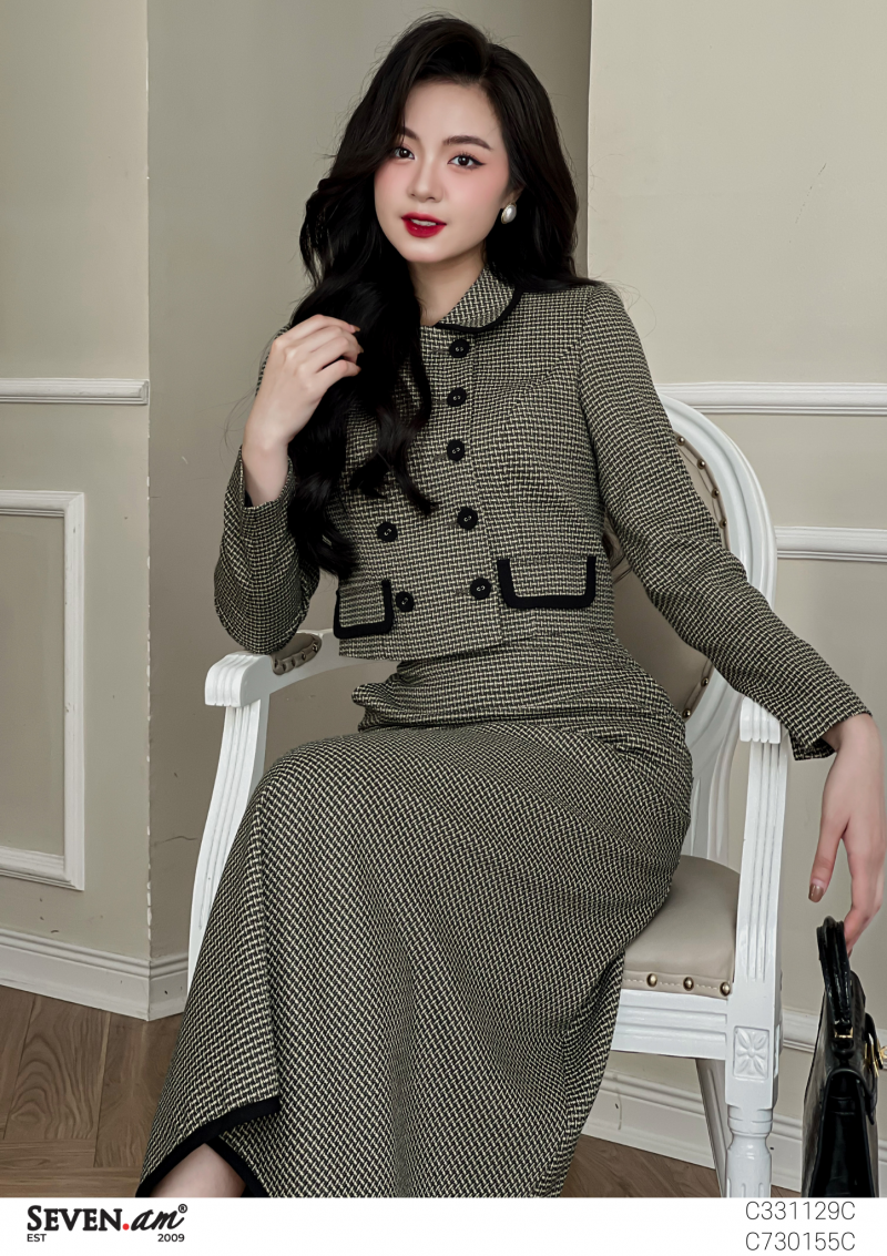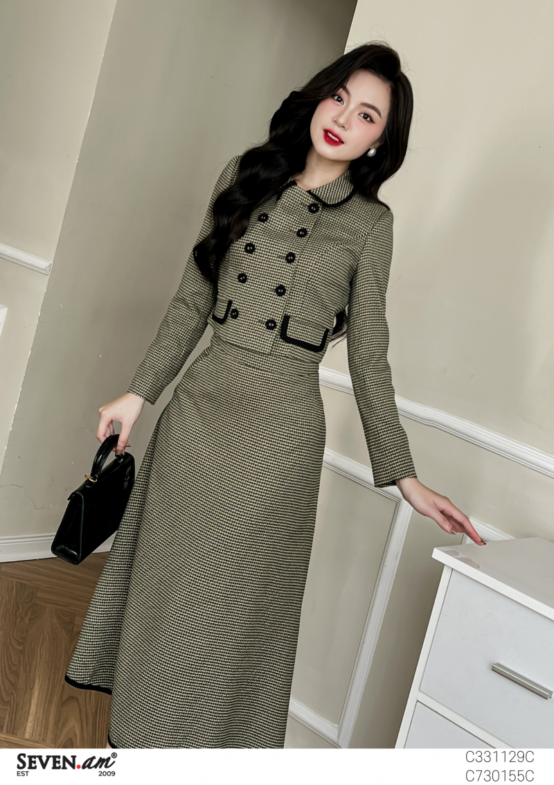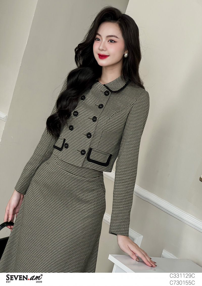 Áo khoác lửng tay dài Thô kẻ be xanh đen cổ lá sen 2 nắp túi giả 2 hàng cúc