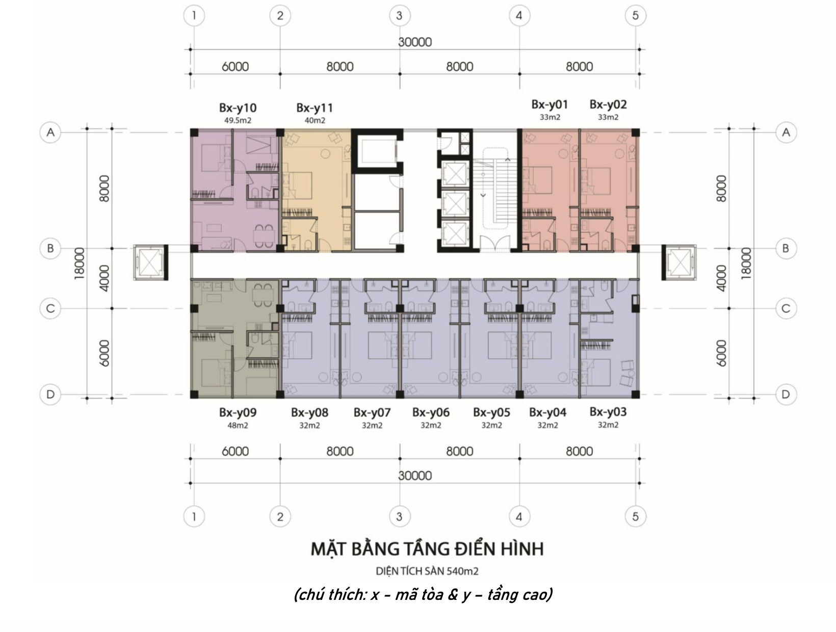 - Diện tích mỗi sàn là 540m2/sàn, bao gồm 11 căn hộ: