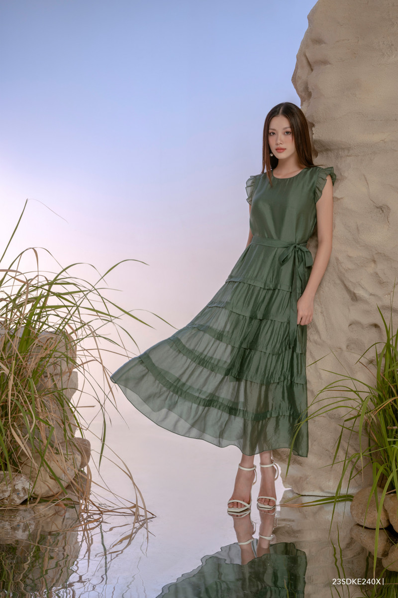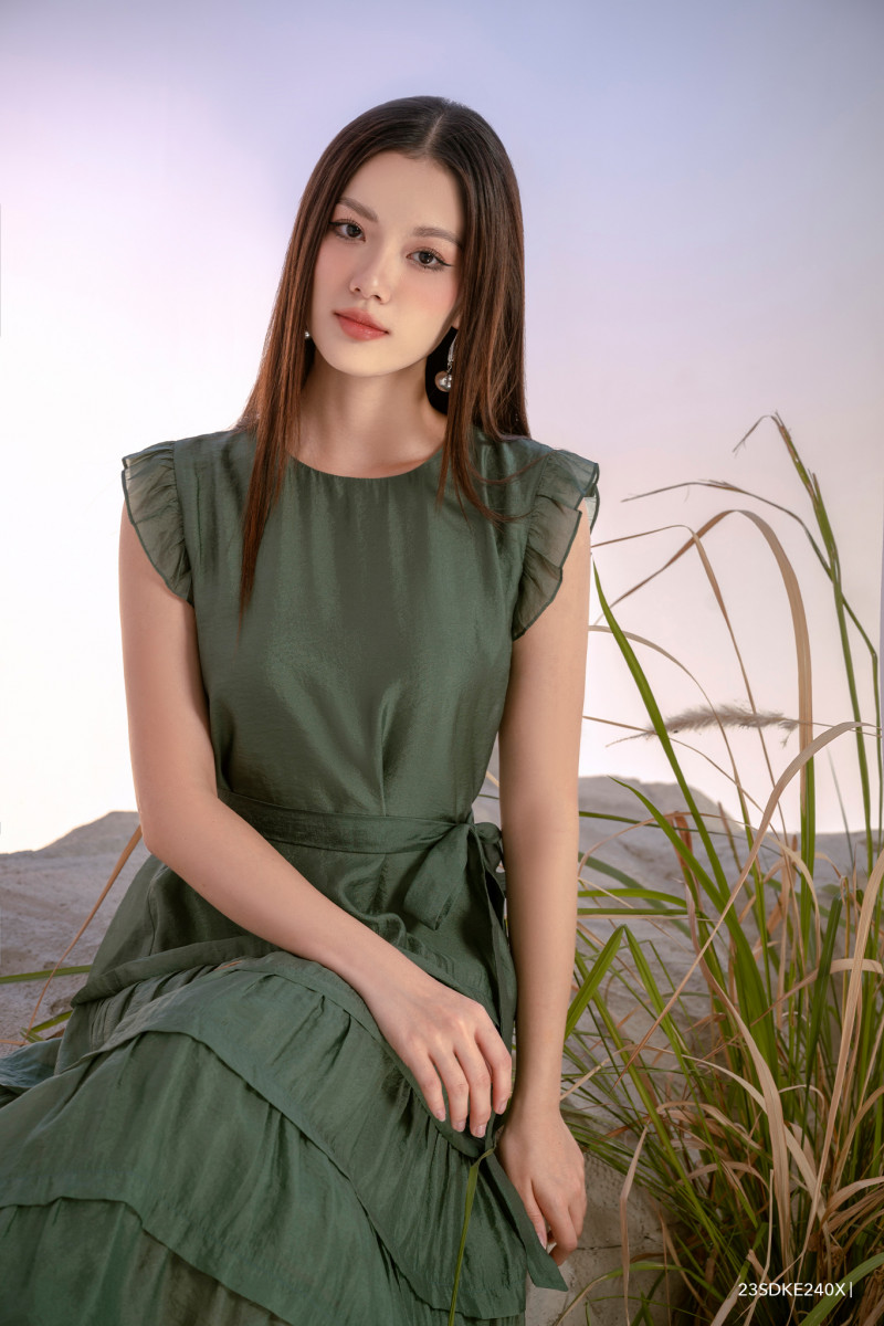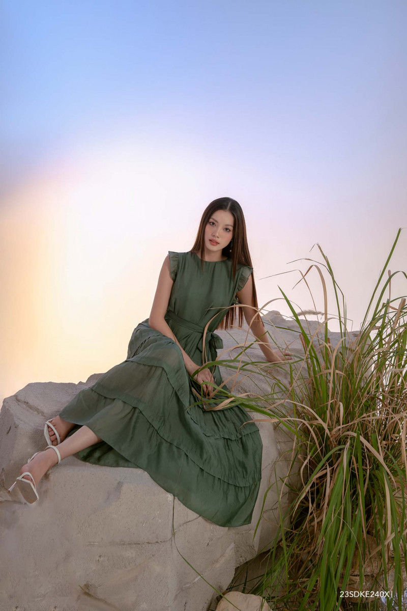 Đầm dài, gam màu xanh dịu mắt, phần thân váy xếp tầng tạo điểm nhấn
