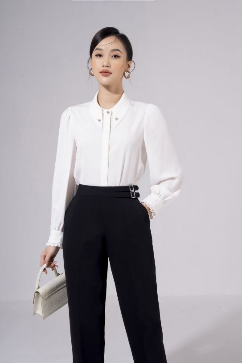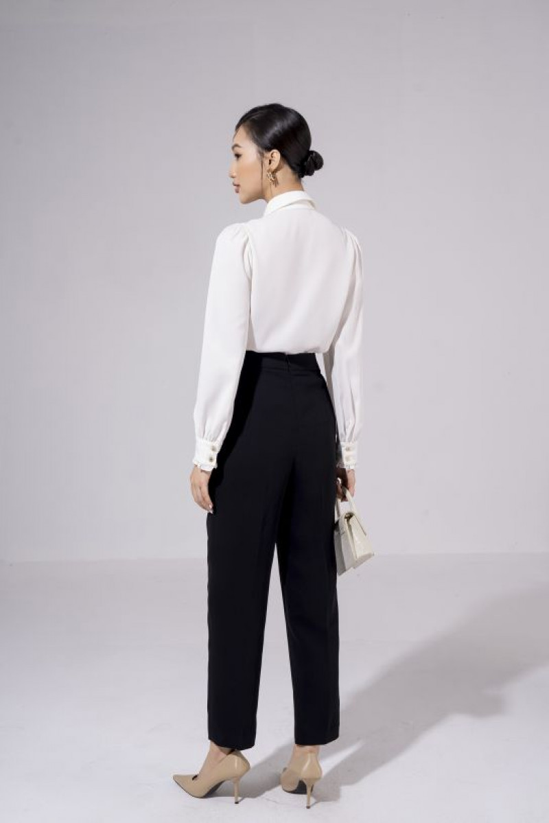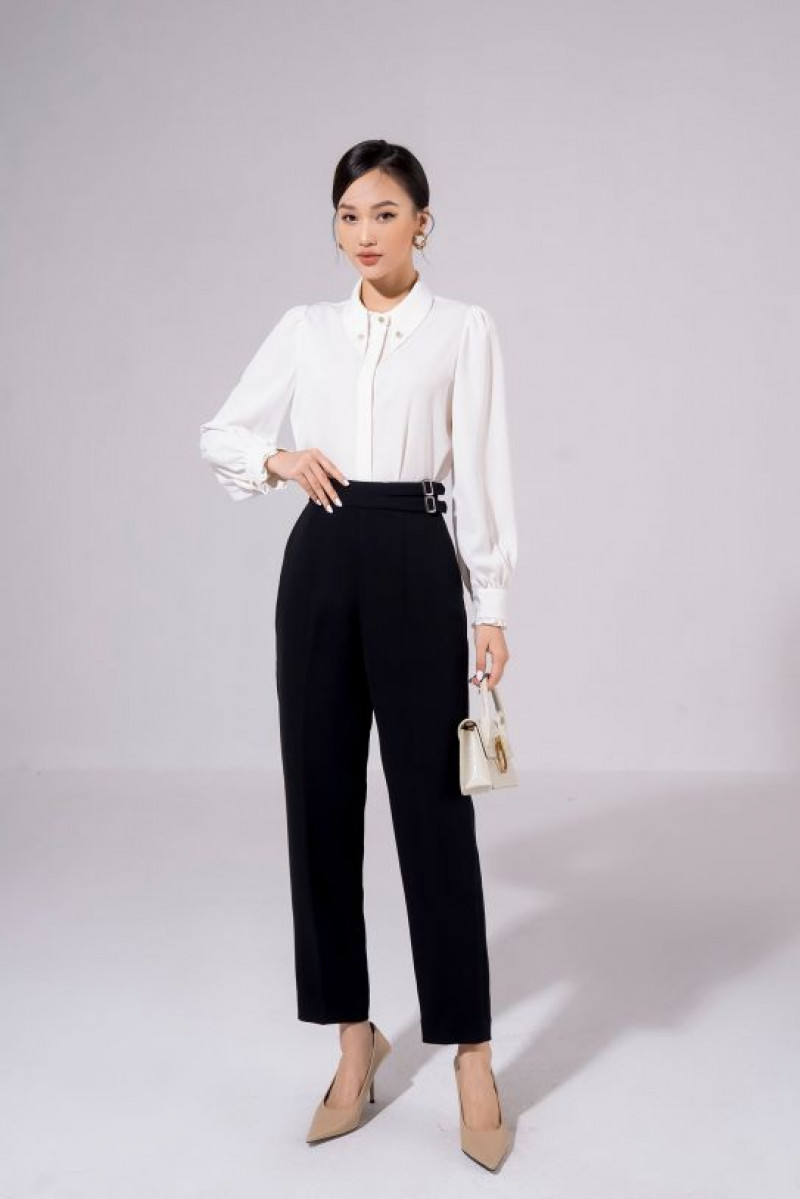 Quần suông phom dáng basic, phần cạp cách điệu.