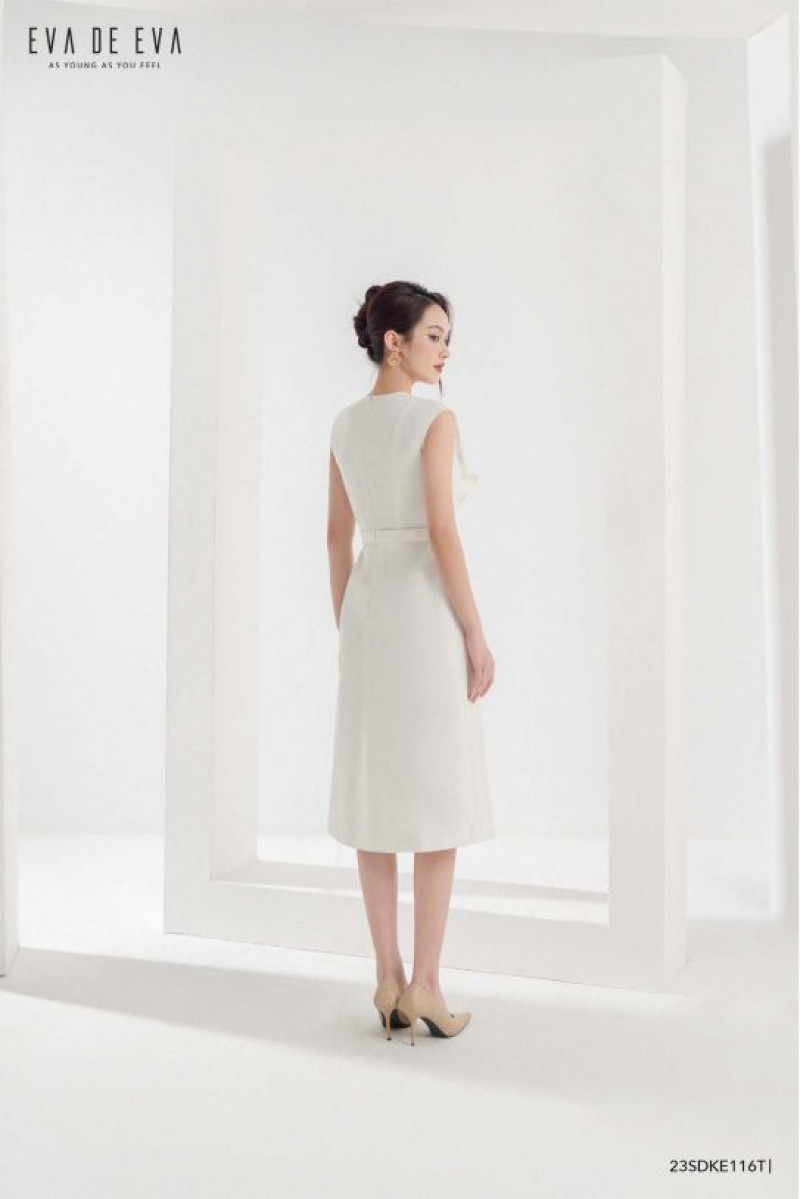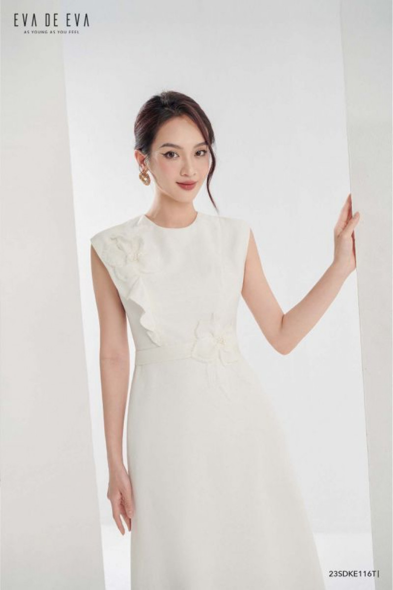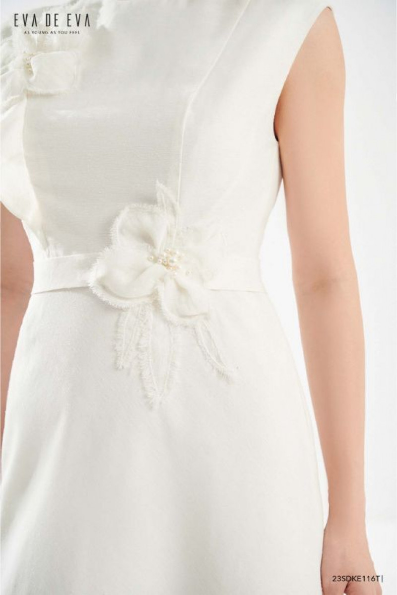 Đầm sát nách, dáng thắt eo, vai chờm, phần bèo ruffer bất đối xứng thân trước, chi tiết trang trí hoa nổi đính hạt làm điểm nhấn, kéo khóa sau.