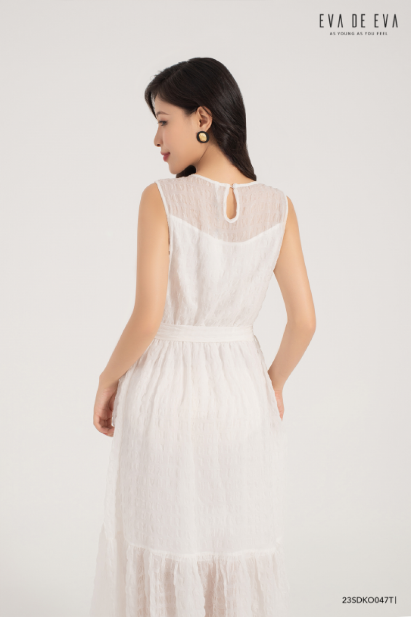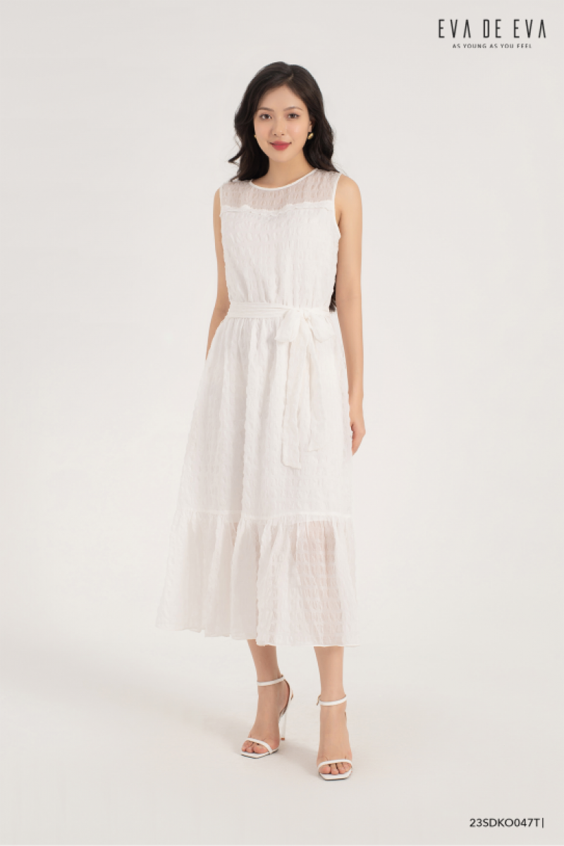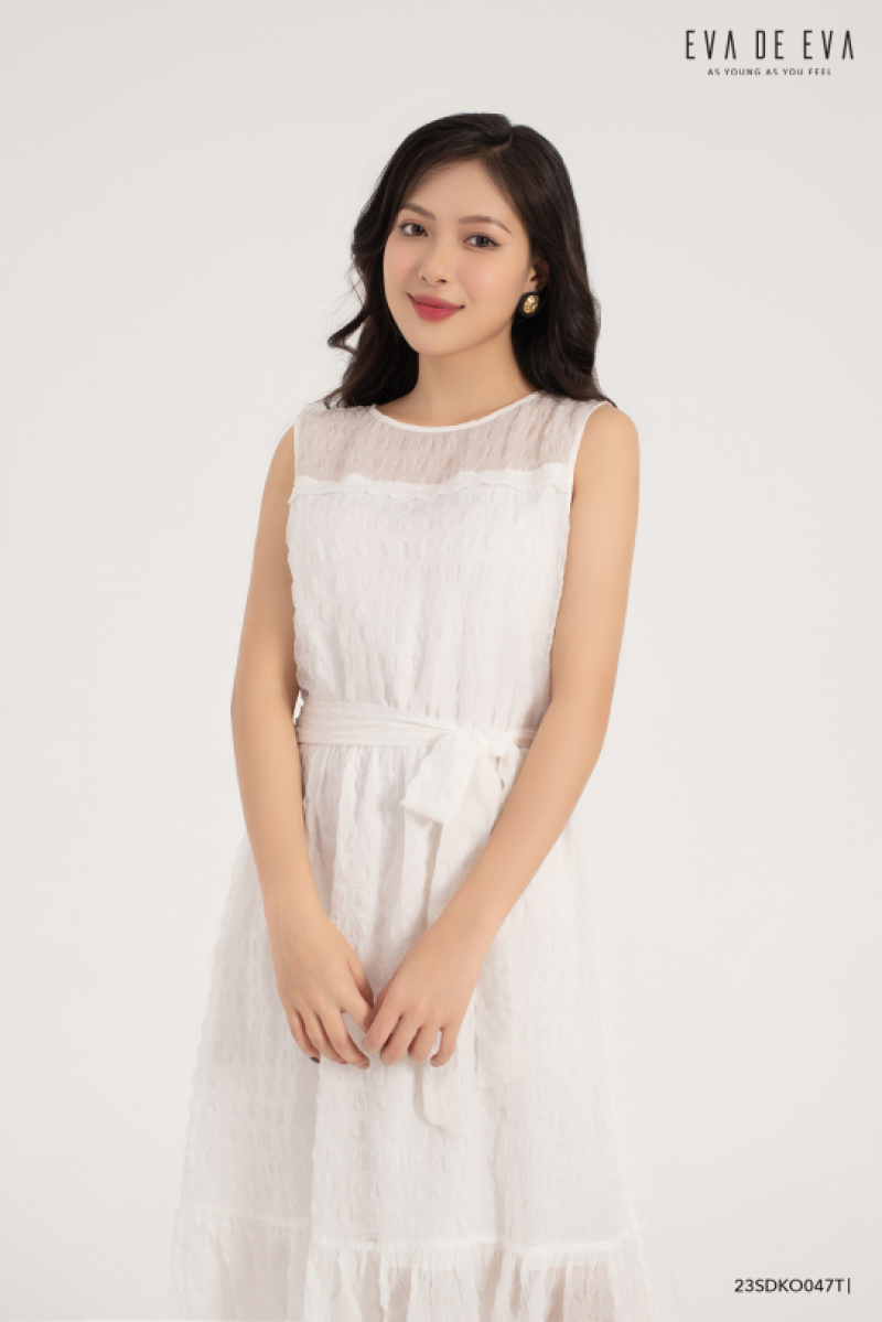 Đầm sát nách, gam màu trắng nhẹ nhàng, thanh lịch, có chi tiết nơ thắt eo cách điệu