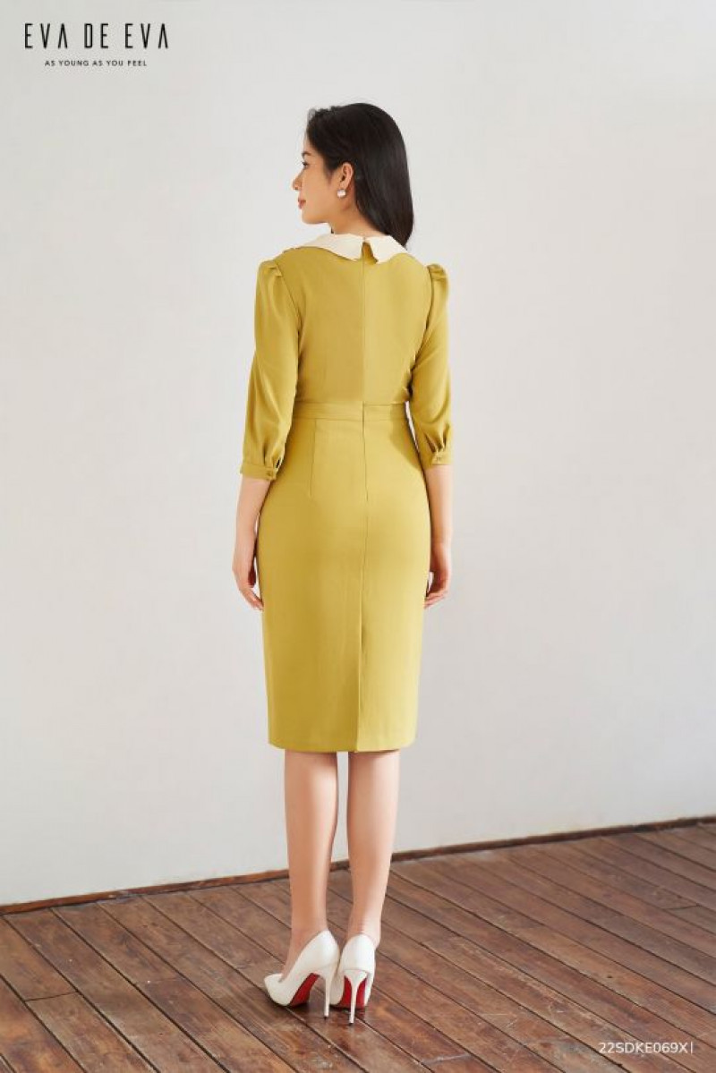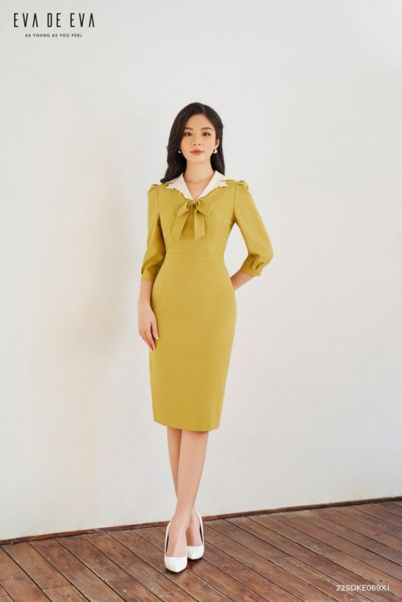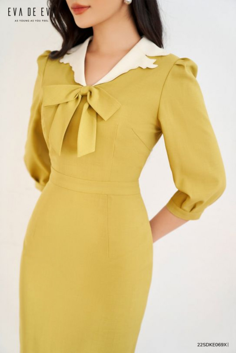 Đầm tay ngắn dáng ôm, cổ phối trắng, có chi tiết nơ trang trí phía trước.