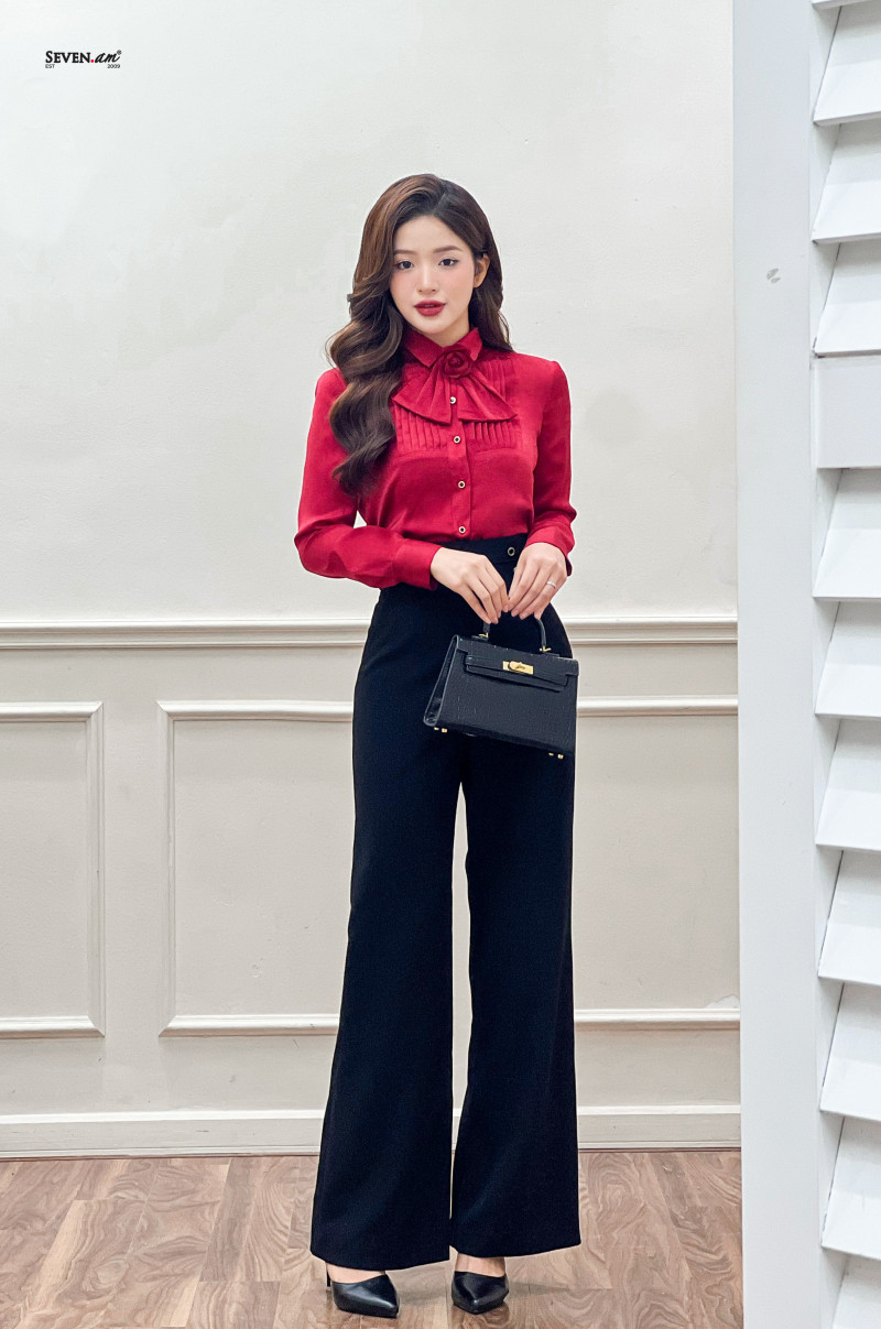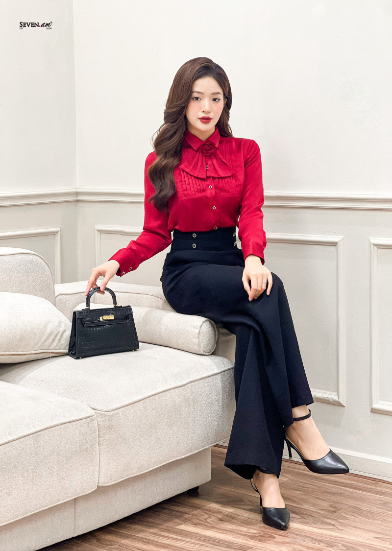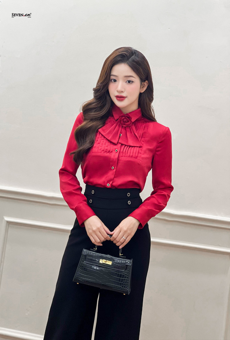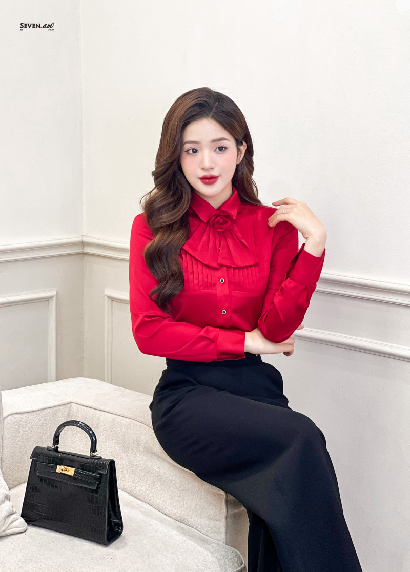 SKU: Áo sơ mi tay dài lụa đỏ cổ đức kèm hoa seven.am+s+do