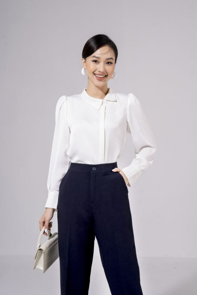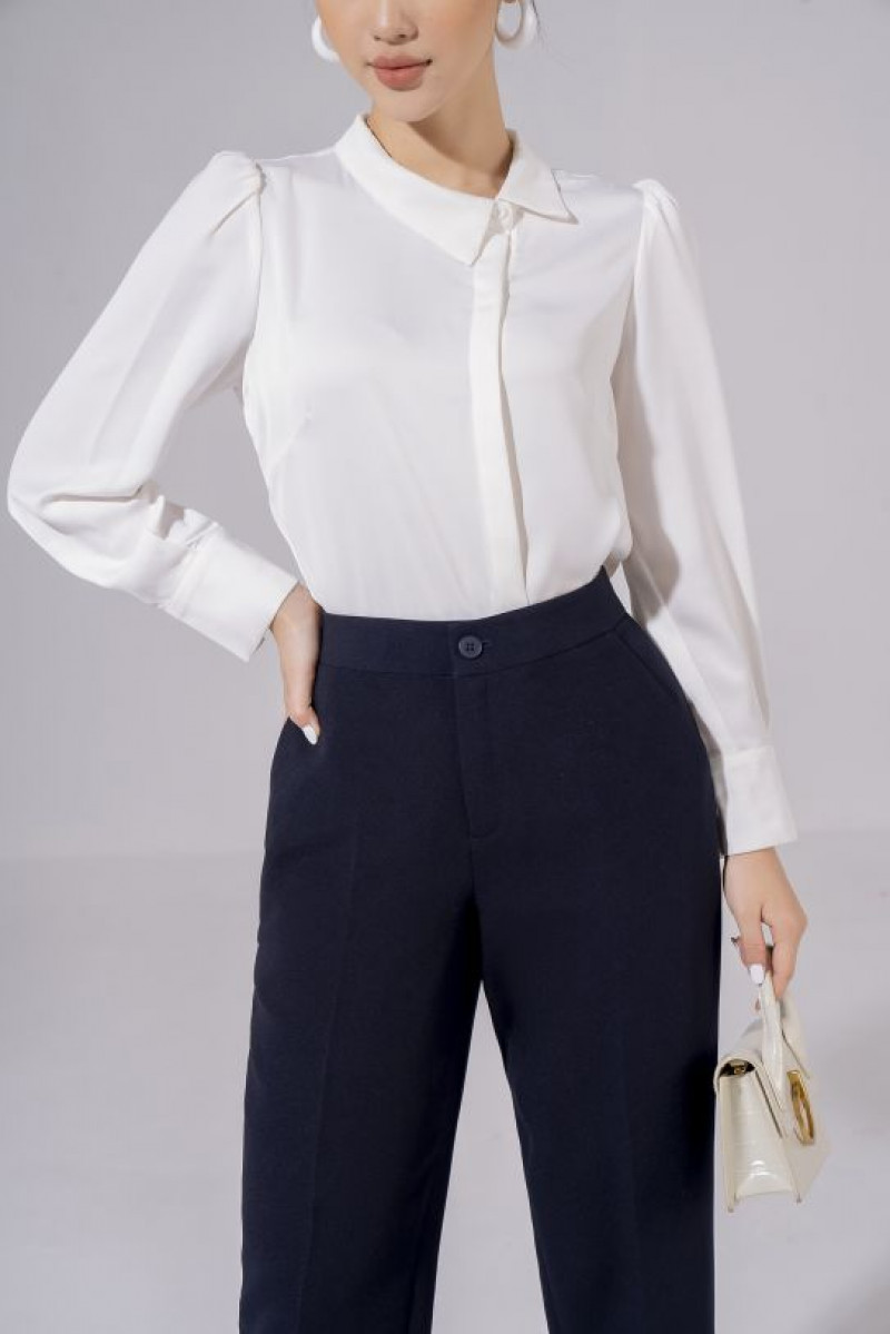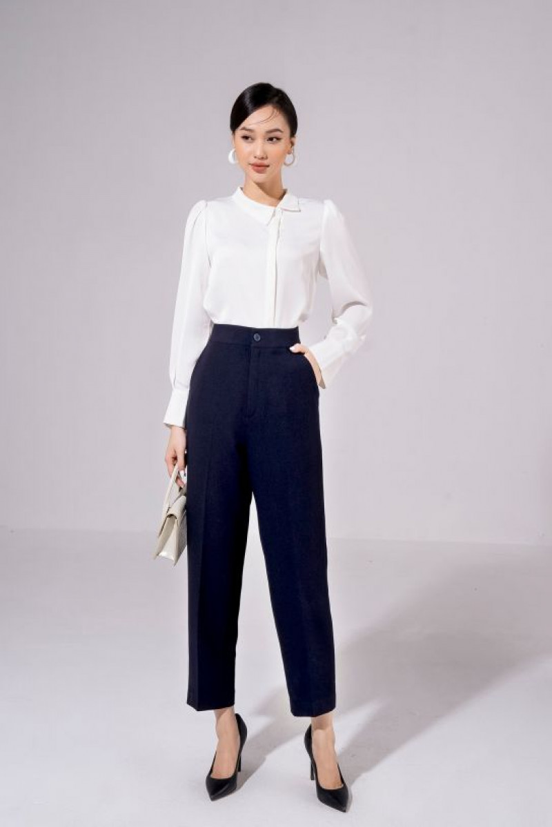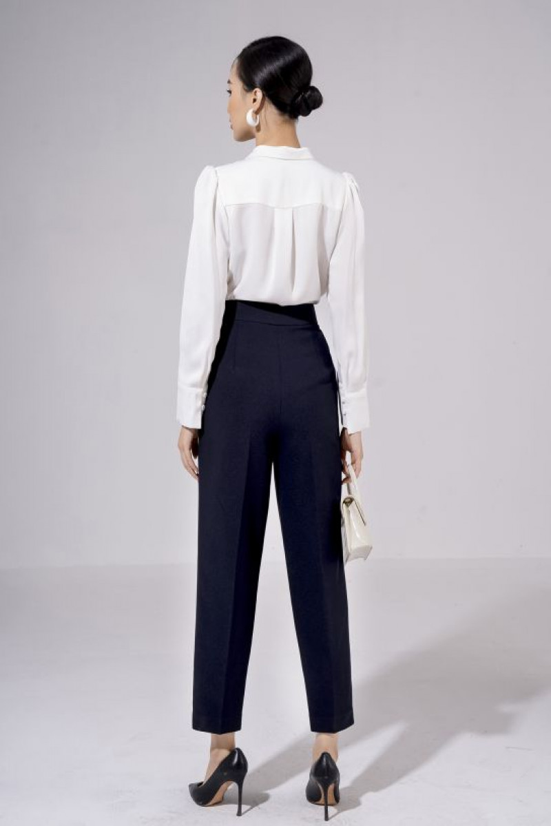Quần suông ống đứng, có chi tiết khuy cài và dập li dọc thân quần.