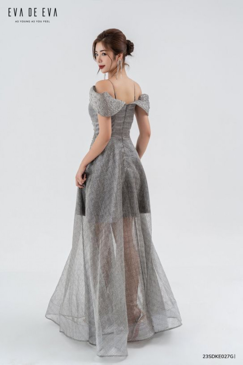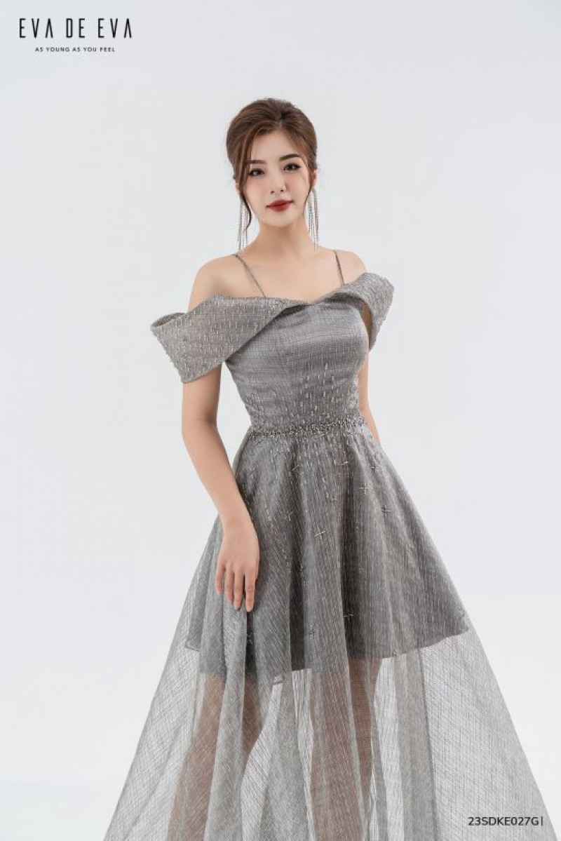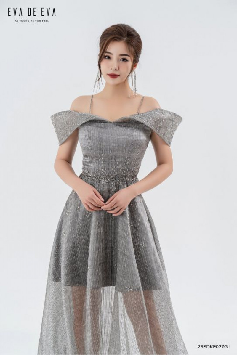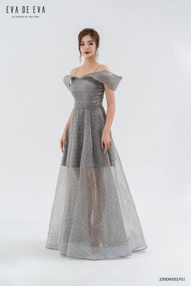 Đầm trễ vai, phần thân dưới xòe rộng, cúp ngực trang trí đính đá.Màu sắc: Ghi